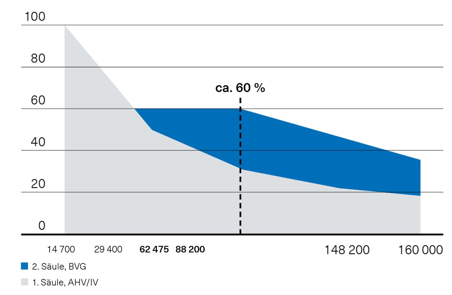 In der Regel decken die 1. und 2. Säule zusammen 60 Prozent des letzten Einkommens ab. Je höher Ihr Einkommen ist, desto wichtiger wird die 3. Säule, damit Sie den gewohnten Lebensstandard auch nach der Pensionierung geniessen können.