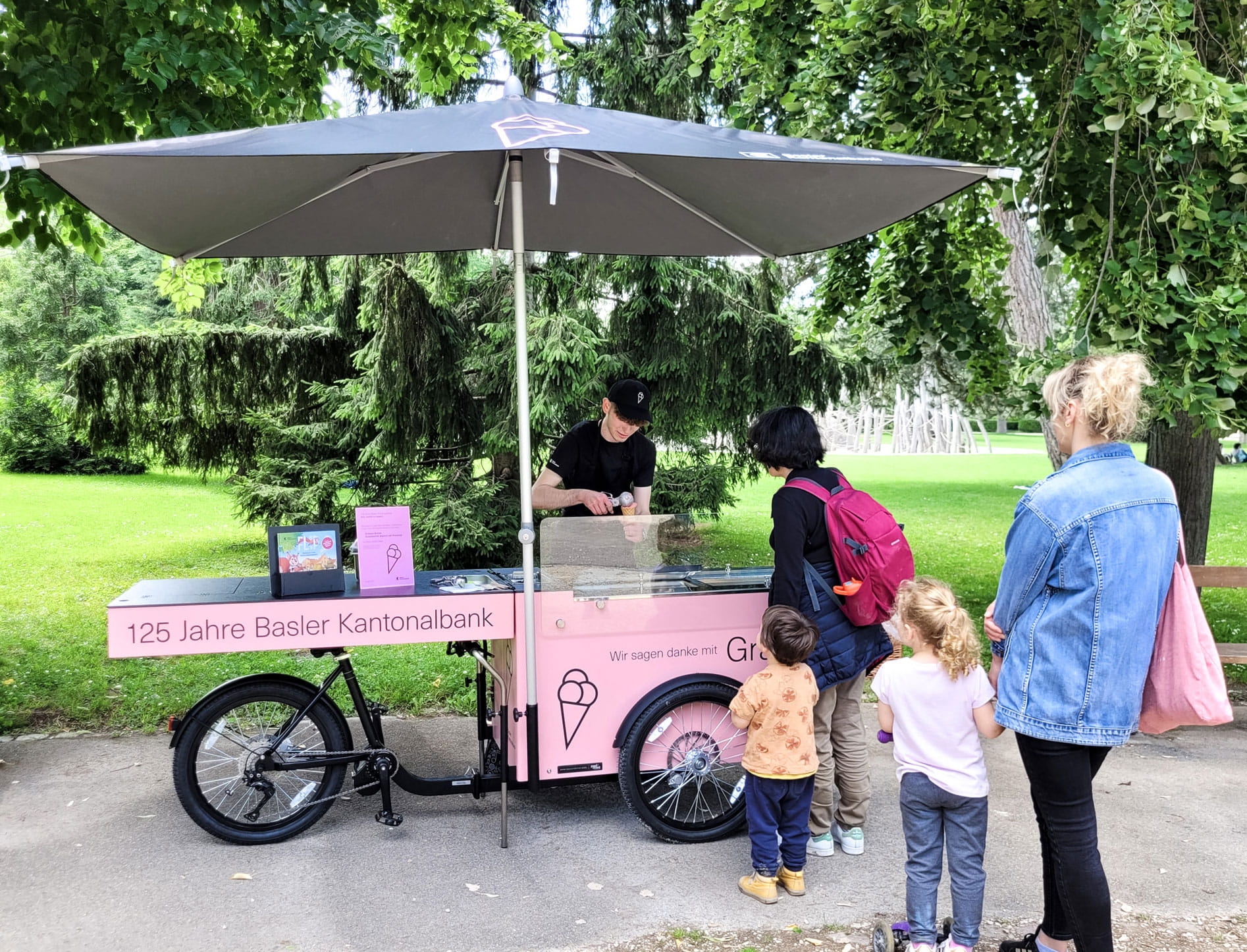 Unser BKB Glace-Velo tauchte an sonnigen Tagen an verschiedenen Orten und Quartieren in der Stadt auf und bot den Baslerinnen und Baslern kostenlos eine süsse Erfrischung an.