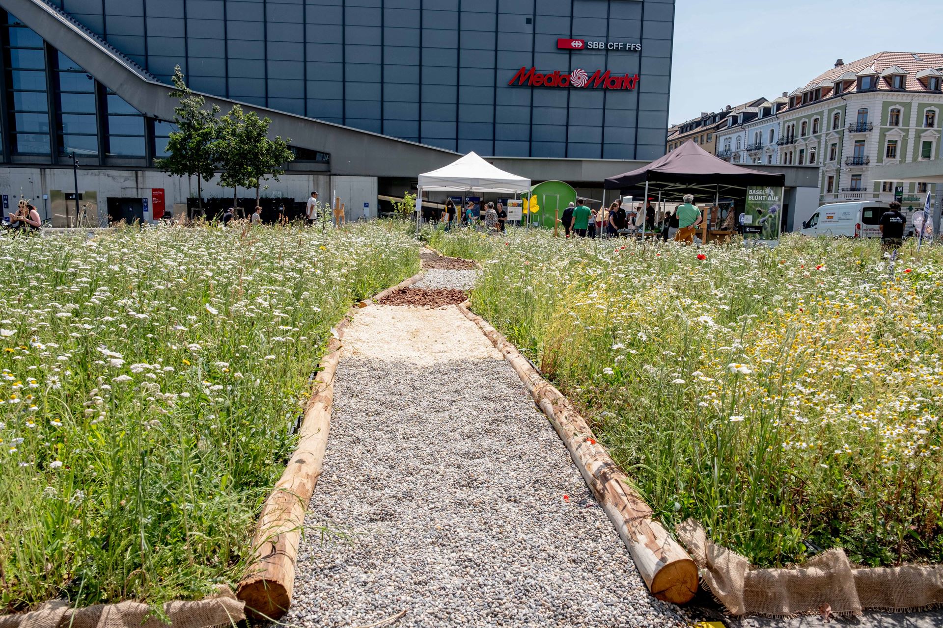 Auf dem Vorplatz unserer Filiale Gundeldingen sowie auf weiteren Firmen- und Privatarealen lebt unsere Blumenwiese auch im Anschluss an die drei aufregenden Tage weiter. SIe ist nun ein angenehmer Aufenthaltsort und Nahrungsplatz für Schmetterlinge, Bienen und Insekten, Reptilien und Co. werden. Das Saatgut unseres Wildblumen-Naturwiesenziegels besteht aus 65 einheimischen Ökotypen. Die Produktion erfolgt in der Schweiz.
