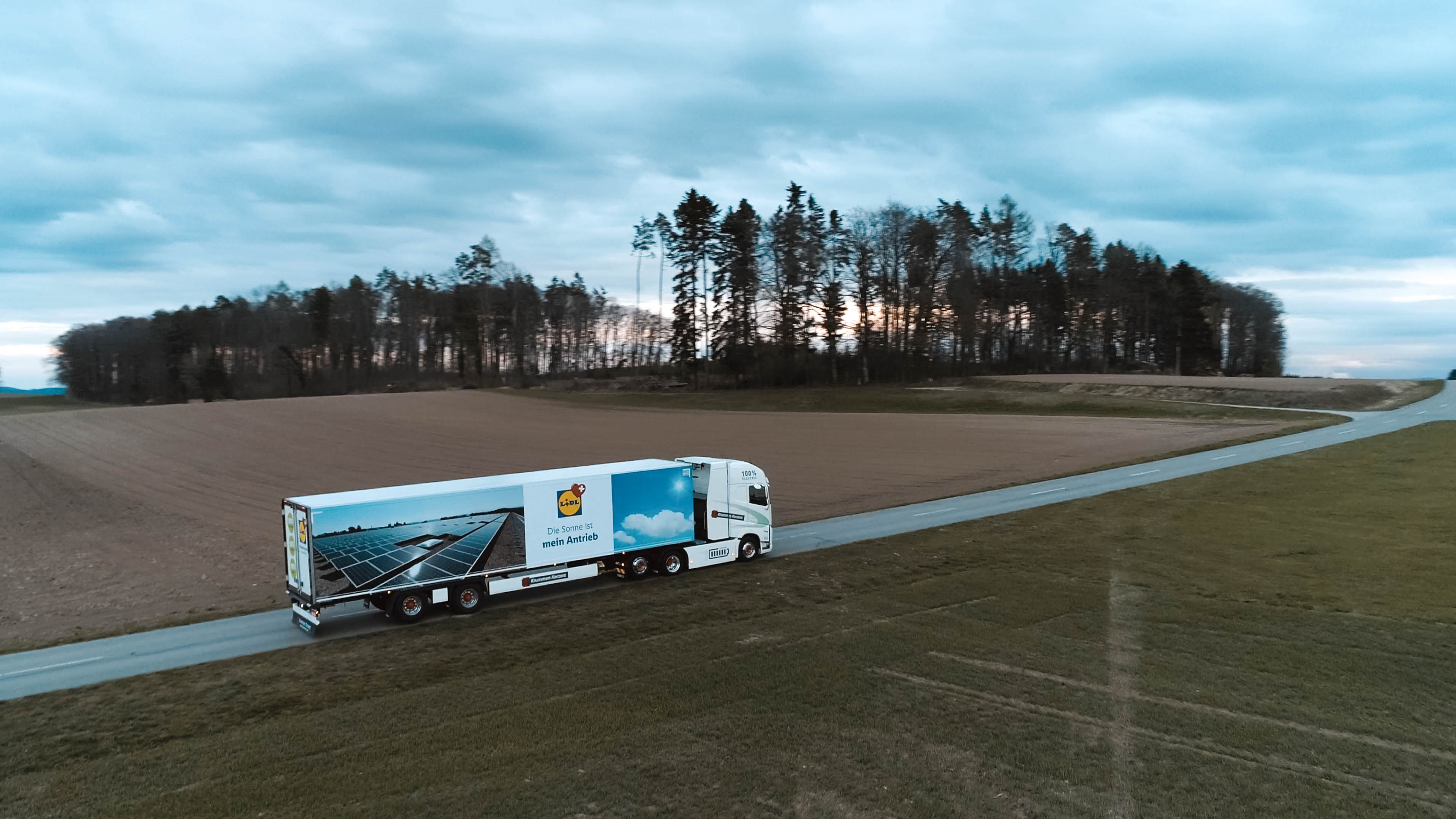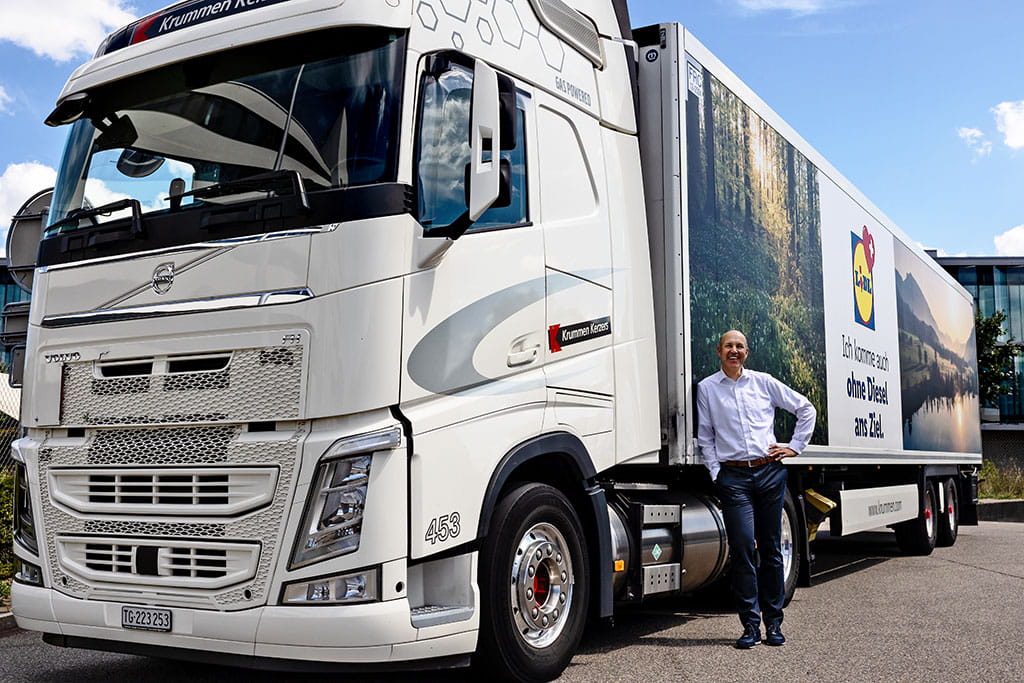 Bild: Schon bald zu 100% fossilfrei unterwegs – Stefan Kopp (CFO Lidl Schweiz) mit einem Biogas-LKW aus der Lidl Schweiz-Flotte