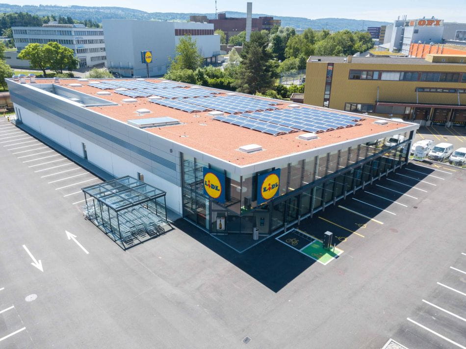 Doch nicht nur in punkto Grösse hat der Konzern eine führende Position. Auch was Nachhaltigkeit angeht ist er ganz vorne mit dabei. So schaffte Lidl Schweiz es zu Beginn letzten Jahres gar als einziger Schweizer Retailer auf die Liste der «Top 10 klimabewussten Unternehmen der Schweiz». Kein Wunder, denn als Resultat einer konsequenten Nachhaltigkeitsstrategie über die gesamte Wertschöpfungskette hinweg ist Lidl Schweiz bereits seit 2014 klimaneutral, hat ein Flugverbot für frisches Gemüse sowie bei frischen Früchten und Kräutern, engagiert sich für die biologische Schweizer Landwirtschaft und Biodiversität, unternimmt Allerlei gegen Food Waste, nutzt Strom aus Wasserkraft u.v.m.Bild: Filiale Lidl Schweiz mit Photovoltaik Anlage und E-Tankstelle für E-Autos und E-Bikes