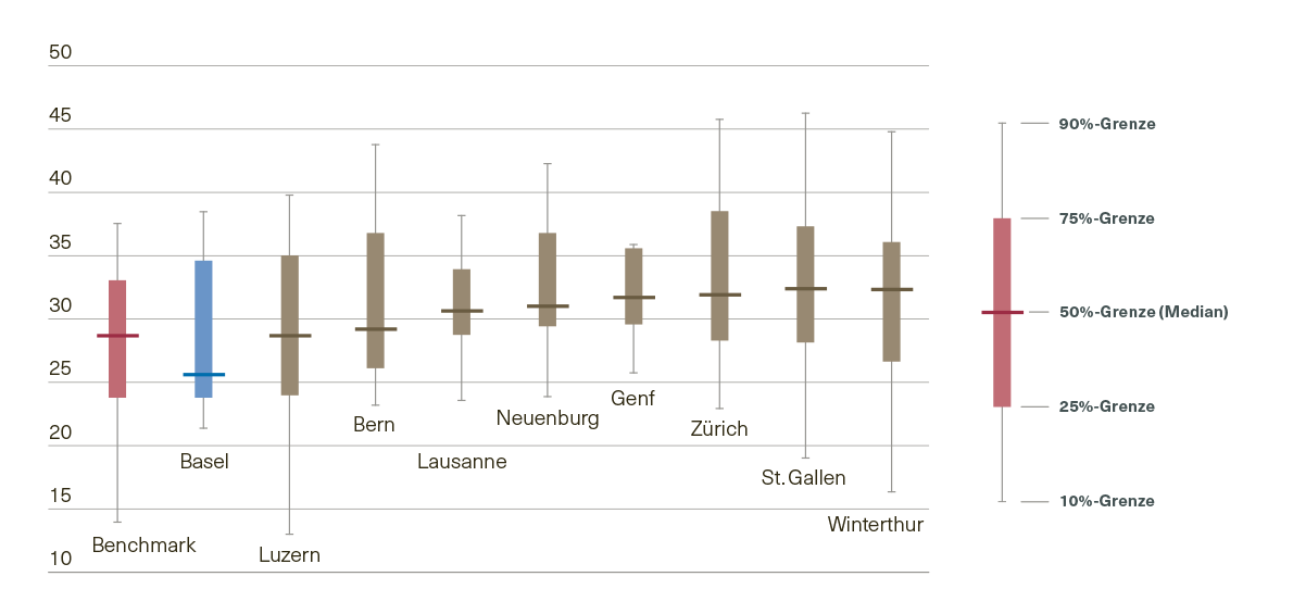 - 50%-Grenze: Bei 50% der untersuchten Liegenschaften liegt der Wert über/unter dieser Grenze.
