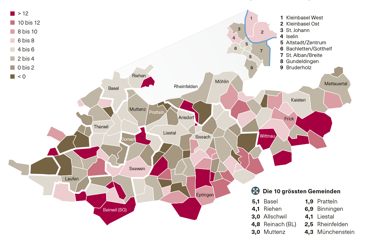 In Basel sind die Angebotsmieten für Wohnobjekte aufgrund der Zuwanderung und der generellen Wohnungsknappheit in den letzten 5 Jahren um rund 5 % gestiegen, wobei die Preiserhöhungen vor allem in Kleinbasel und im Iselin Quartier deutlich waren (Zunahme um 6 bis 8 %). Mieterhöhungen von über 12 % wurden u.a. in Bettingen verzeichnet, das damit gleich teuer geworden ist wie Riehen. Aufgrund der hohen Mietpreise in der Stadt bzw. der Wohnungsknappheit sind in den letzten 5 Jahren aber auch in vielen peripheren Gemeinden die Mieten um über 10 % angestiegen. Durch einen Umzug von Riehen nach Beinwil lässt sich jedoch noch immer eine Mietzinsersparnis von rund 30 % erzielen.