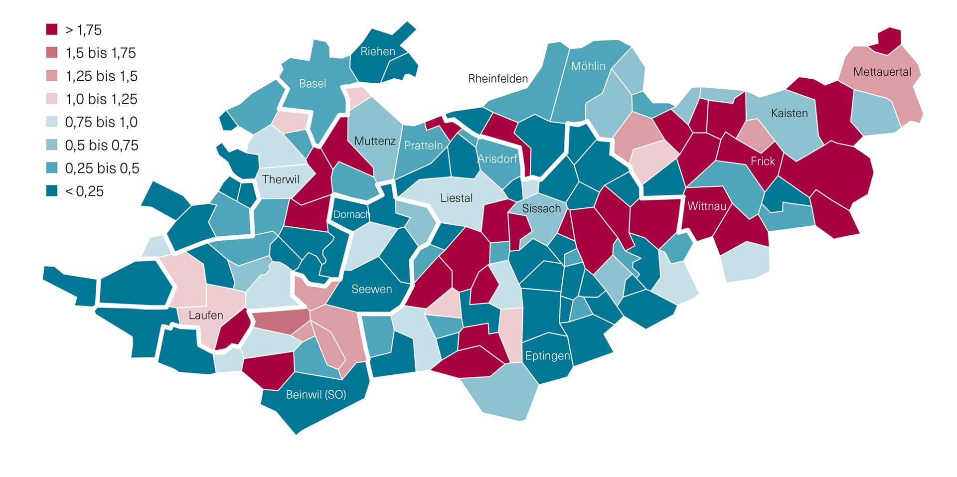 Ein Blick auf die bewilligten Bauprojekte (2020 bis 2022) zeigt, dass das Wohnungsangebot in Basel-Stadt auch in der Zukunft mit der Zuwanderung kaum mithalten kann. Aufgrund des knappen Baulandes wird in den kommenden Jahren primär im östlichen Umland der Region gebaut werden. In Basel-Stadt liegt die Bewilligungsquote bei unter 0,3 %. Etwas günstiger sieht es aus im Birseck, wo insbesondere in Münchenstein (+3,8 %), Reinach (+5,3 %) und Aesch (+7,6 %) viele Bauvorhaben in der Pipeline sind.