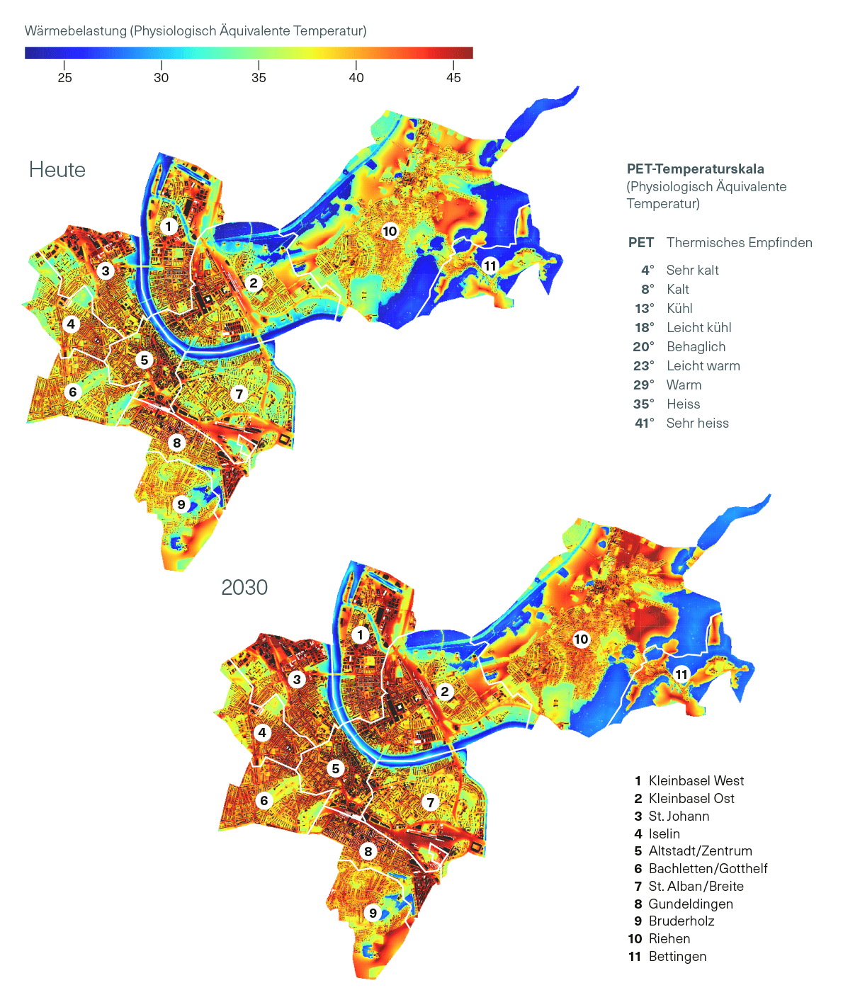 Viele Vorzüge machen Basel als Wohnort attraktiv. Dennoch ist es heute schon im Sommer in manchen Quartieren sehr heiss. Vor allem in der Altstadt, im St. Johann, im Gundeli und auch im Kleinbasel liegt an Sommertagen die gefühlte Temperatur zum Teil bei deutlich über 40 Grad. Gemäss einer Modellrechnung des Kantons werden sich wegen der Klimaerwärmung bis 2030 über 50 % des Stadtgebietes im Sommer auf über 40 Grad aufheizen. Angenehm ist es dann an einem typischen Sommertag nur noch am Rheinbord und in den Langen Erlen. Damit ergeben sich für Immobilieninvestoren zusätzliche Herausforderungen in Bezug auf die Schaffung von Grünflächen. Ob, wo und wann sich die Wärmebelastung auf die Mieten auswirken wird, bleibt abzuwarten.