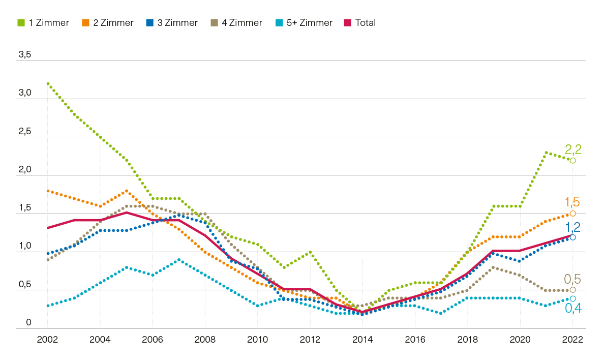 Aufgrund der relativ geringen Leerstände bei Wohn- und Büroflächen und der robusten Nachfrage ist allerdings davon auszugehen, dass die Angebotsmieten weiter steigen werden. Weil mit dem allgemeinen Zinsanstieg eine Anhebung des hypothekarischen Referenzzinssatzes als sicher gilt, werden auch bei Bestandsmieten Mietzinsanpassungen möglich sein. Beides wird sich positiv auf die Rendite auswirken.