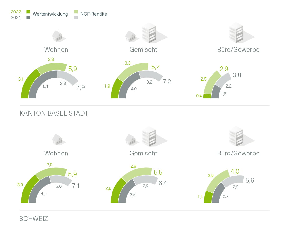 Die Gesamtperformance, die sich aus dem Wertzuwachs und dem Netto-Cashflow (NCF) ergibt, lag in Basel-Stadt bei allen Liegenschaftskategorien tiefer als im Vorjahr. Besonders deutlich war der Rückgang bei Wohnimmobilien (-2 % auf 5,9 %), wo der Wertzuwachs mit +3,1 % einen geringeren Renditebeitrag geleistet hat als 2021 (+5.1 %). Am tiefsten war die Performance bei Büro-/Gewerbeliegenschaften mit 2,9 % (-0,9 % gegenüber dem Vorjahr). Damit haben die Immobilienanlagen gegenüber anderen wertbeständigen Anlageformen, wie z.B. Bundesobligationen, an Attraktivität eingebüsst.