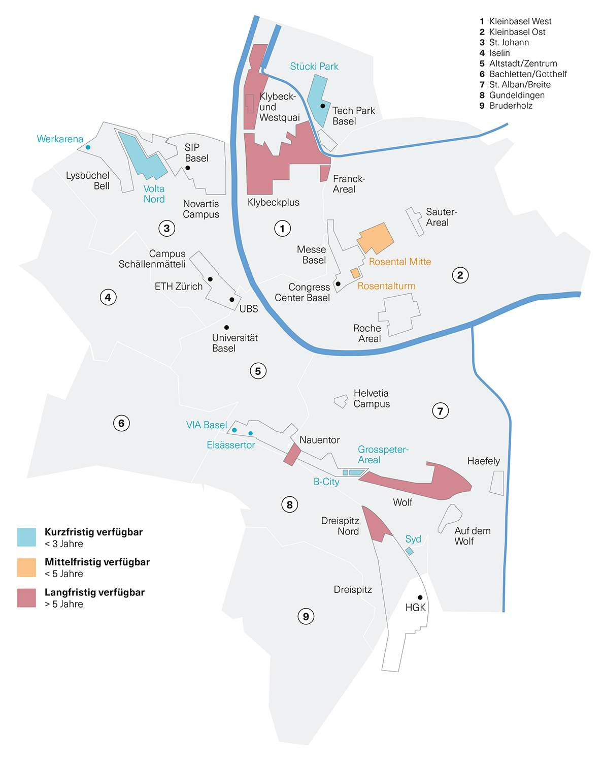 Auch wenn freie Flächen in Basel knapp sind, gibt es weiterhin grosses Potenzial für neue Wohn- und Geschäftsräume. Möglich machen das grössere Arealentwicklungen. In den kommenden drei Jahren könnten so rund 80 000 m2 neue Büro- und Geschäftsflächen entstehen. Gleichzeitig werden Tausende neue Wohnungen gebaut. Das dürfte den Wohnungsmarkt mittel- bis langfristig spürbar entlasten.