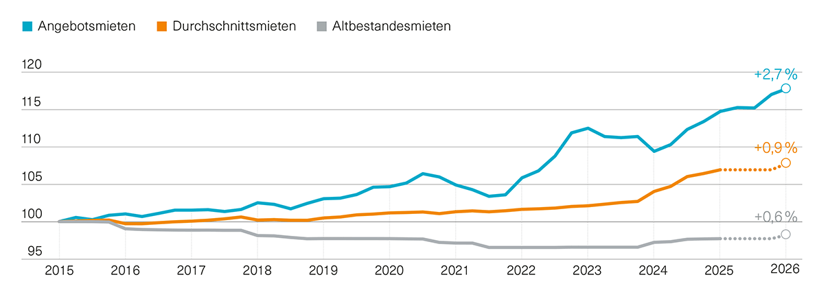 Sowohl bei Wohnimmobilien als auch bei Büro- und Gewerbeflächen mehren sich die Zeichen einer Stabilisierung. 2025 haben sich die Werte erstmals wieder gefestigt. Gleichzeitig bieten grössere Arealentwicklungen Raum für Tausende neue Wohnungen. Damit könnte sich die heutige Angebotsknappheit in der Region langfristig deutlich entspannen. Kurzfristig jedoch ist eher von einem weiteren Anstieg der Mieten auszugehen.