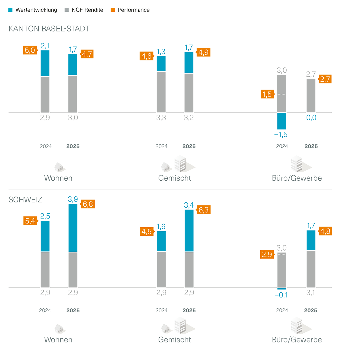 Basler Renditeliegenschaften blieben auch 2025 eine attraktive Anlage. Besonders gemischt genutzte Liegenschaften sowie Büro- und Gewerbeimmobilien erzielten höhere Gesamtrenditen als im Vorjahr. Wohnimmobilien in Basel-Stadt kamen auf eine Gesamtrendite von 4,7 %.