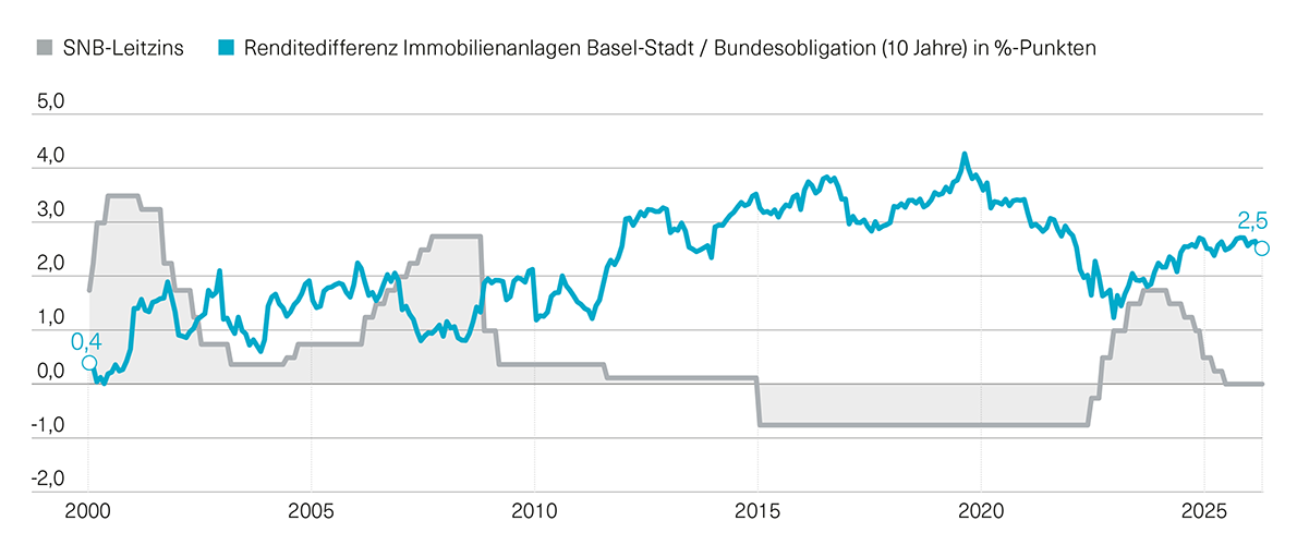 Abb. 2: Renditedifferenz zwischen Immobilien im Kanton BS und Schweizer Bundesobligationen (in %)