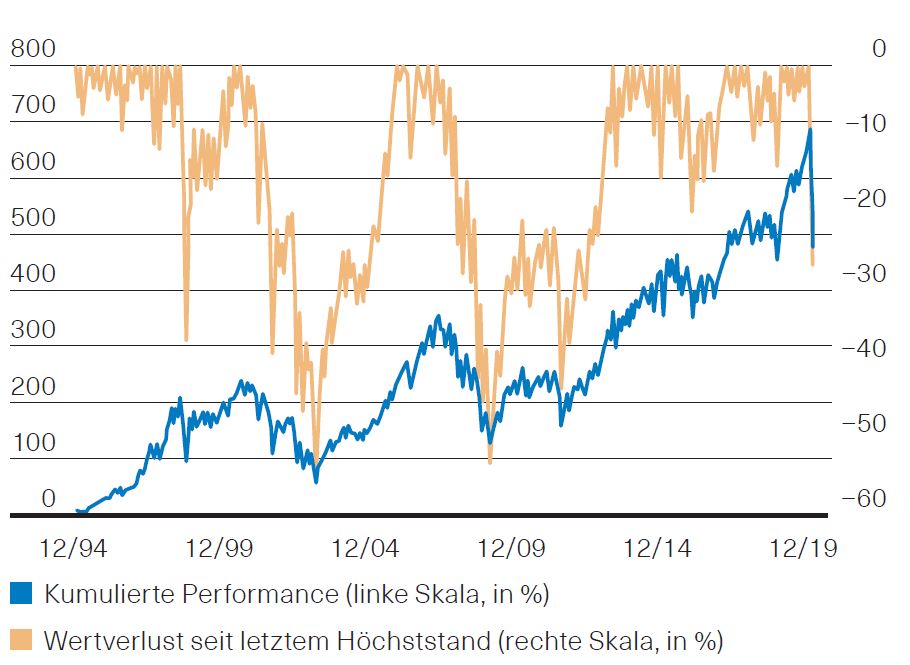 Abb. 2: Langfristige Performance und temporäre Wertverluste am Schweizer Aktienmarkt; Swiss Performance Index, seit 31.12.1994;