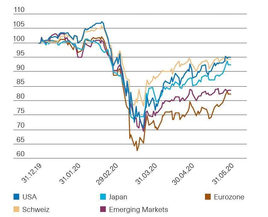 Die mit den Lockerungsmassnahmen ausgelöste Hoffnung auf eine Rückkehr zur wirtschaftlichen Normalität hat den Aktienkursen im Mai weiteren Auftrieb gegeben. Aktien der Sektoren Industrie, diskretionäre Konsumgüter und Technologie hatten im Marktvergleich die grössten Kursgewinne. Dagegen hinkten insbesondere Energiewerte, nichtzyklische Konsumtitel sowie der Finanzsektor der allgemeinen Marktentwicklung hinterher. Auf regionaler Ebene lagen dementsprechend die zyklisch ausgerichteten Aktienmärkte der Eurozone (+5,9 % in CHF) und Japans (+5,4 % in CHF) vorne. Auch amerikanische (+4,6 % in CHF) und Schweizer Aktien (+2,4 %) konnten zulegen, wohingegen die Aktienperformance in den Schwellenländern regional sehr durchmischt war und aggregiert auf 0,3 % in CHF kam. Dennoch liegen die Aktienmärkte weiterhin mehr oder weniger deutlich unter ihren bisherigen Jahreshöchstständen – von –8,8 % für Japan bis –19,3 % für die Eurozone (Abb. 1).