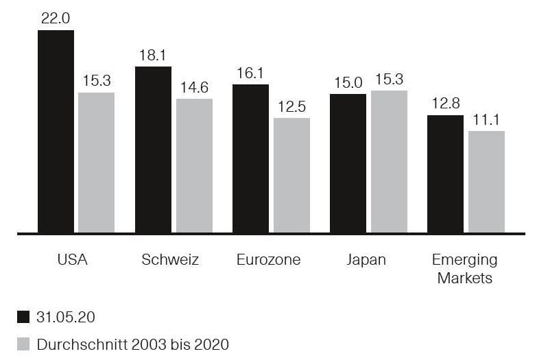 Nachdem wir mit einer Untergewichtung bei den Aktien in das neue Jahr gestartet waren und am 24. Februar die Untergewichtung ausgebaut hatten, waren wir nach situativ im März getätigten Zukäufen bei den Aktien Anfang Mai neutral gewichtet. Angesichts der Verschlechterung der Lage in den USA – sowohl in Bezug auf die Bemühungen zur Eingrenzung der Pandemie als auch hinsichtlich der zu erwarteten Wirtschaftsdaten – haben wir zur Monatsmitte die Aktienquote um 3 % zulasten der US-Märkte reduziert.Abb. 2: Aktienbewertungen; Erwartetes Kurs-Gewinn-Verhältnis