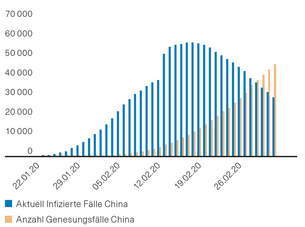 Wir haben angesichts der veränderten Risikosituation im Hinblick auf eine globale Pandemie zu Beginn der letzten Februarwoche unsere bereits leicht untergewichteten Aktienquoten in den Vermögensverwaltungsmandaten um weitere 2 % reduziert. Nach der Marktkorrektur lag unsere Aktienquote zum Monatsende rund 6 % unter der strategischen Quote. Da die Kursrückgänge panikartige Züge angenommen hatten, von Staaten und Notenbanken fiskal- und geldpolitische Unterstützung erwartet werden durfte, die Eindämmung des Coronavirus zumindest in China auf gutem Weg (Abb. 2) und seine Mortalitätsrate im Vergleich zu anderen Grippewellen nicht exorbitant schien, in den Industriestaaten auf nationaler Ebene ein besonnener Umgang mit der Epidemie stattfand und die Aktienbewertungen aufgrund der Korrektur deutlich zurückgekommen waren, haben wir Anfang März unser Untergewicht wieder reduziert und 3 % Aktien gekauft. Wir bleiben aber weiterhin untergewichtet. Eine Verschärfung der Situation ist zunächst wahrscheinlich, die Infektionsfälle ausserhalb Chinas dürften weiter deutlich ansteigen. Die Konjunktur dürfte besonders im ersten Quartal nicht nur in China, sondern global leiden. Dementsprechend werden auch die Gewinnerwartungen bei den Unternehmen nach unten angepasst werden müssen.