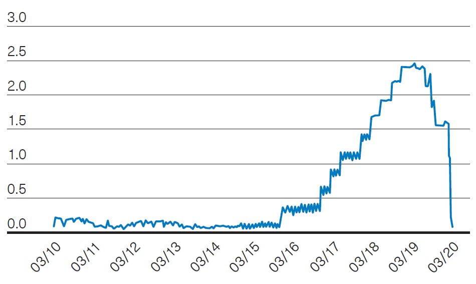 Die US-Zentralbank (Fed) verabschiedete an ihrer Sondersitzung ein umfassendes Hilfspaket zur Stützung der Wirtschaft und Stabilisierung des Finanzsystems. Zum einen senkte das Fed seinen wichtigsten Leitzins um 100 Basispunkte auf 0 % – 0,25 % (Abb. 1). Zu den Massnahmen gehören aber auch der direkte Kauf von Unternehmensanleihen am Primär- und Sekundärmarkt sowie der unbegrenzte Kauf von US-Staatsanleihen und hypothekengesicherten Wertpapieren. Zudem sollen Privatunternehmen Kredite zur Verfügung gestellt werden. Laut Fed-Chef Powell wird das Fed so viele US-Staatsanleihen und hypothekenbesicherte Wertpapiere kaufen, wie für ein reibungsloses Funktionieren der Märkte und die Umsetzung der Geldpolitik notwendig sind.