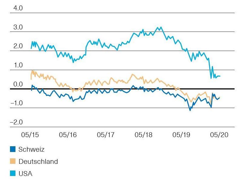 In den USA steigt der politische Druck, mit den begonnenen Lockerungsmassnahmen fortzufahren. Auch werden die Rufe nach einem erneuten beträchtlichen US-Fiskalpaket lauter. Diese Forderung erhält zusätzliche Unterstützung von Fed-Chef Powell. Er rechnet mit einer langsamen Erholung in der zweiten Hälfte dieses Jahres. Der Wiederaufbau der US-Wirtschaft wird deutlich länger dauern als der plötzliche Einbruch. Dabei hält die US-Notenbank (Fed) an ihrem aktuellen geldpolitischen Instrumentarium fest. Den aufkeimenden Marktspekulationen über eine mittelfristige Einführung negativer Leitzinsen setzte Powell vorerst ein jähes Ende. Bei den Fed-Mitgliedern besteht Konsens darüber, dass Negativzinsen in den USA nicht die erwünschte Wirkung erzielen würden. Die bisherige Politik mit Leitzinsen nahe null, das Versprechen, die Zinsen so lange niedrig zu halten wie nötig, sowie die massiven Anleihekäufe und Kreditprogramme sind aus Sicht des Fed deutlich effektiver.