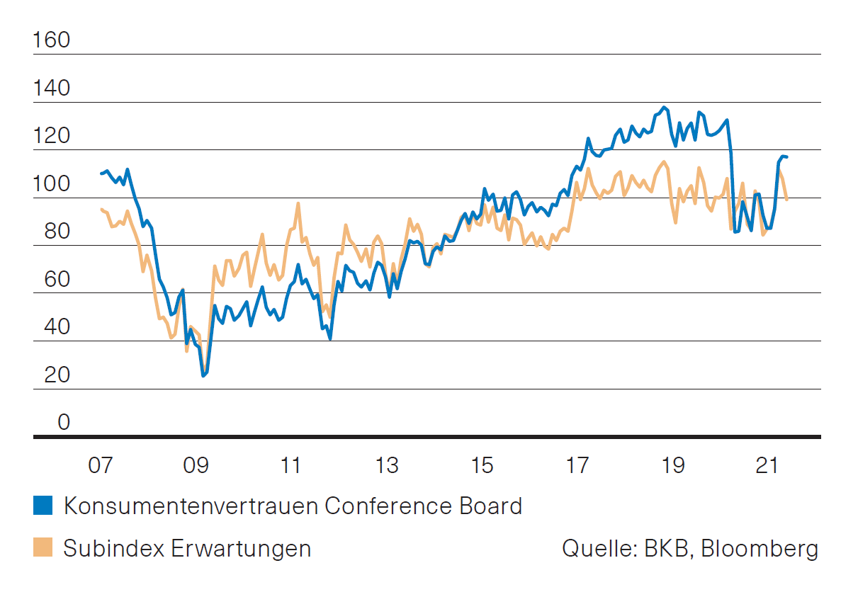 Auch die zweite Schätzung zum Wachstum des Bruttoinlandsprodukt bestätigte die hohe Dynamik im ersten Quartal. Im Vergleich zum Vorquartal legte das BIP um mehr als 6 % (QoQ, annualisiert) zu. Als wichtiger Faktor erwies sich dabei der private Konsum. Seine Zunahme lag bei hohen 11 %. Die Bedeutung des privaten Konsums ist nicht zu unterschätzen, trägt er doch rund 70 % zur gesamten Wirtschaftsleisung bei. Die Stimmung unter den Verbrauchern ist dabei ein wichtiger Indikator. Die vom Conference Board ermittelte Konsumentenstimmung hat nach ihrem jüngsten Anstieg eine Verschnaufpause eingelegt (Abb. 1). Während sich die Beurteilung der aktuellen Lage weiter verbesserte, ist die Erwartungskomponente etwas gesunken, bewegt sich aber weiter auf hohem Niveau. Die tieferen Erwartungen dürften mitauslaufenden Hilfen im Zusammenhang mit der Covid-19-Pandemie zusammenhängen. Die Aussichten für die US-Wirtschaft bleiben dennoch positiv.