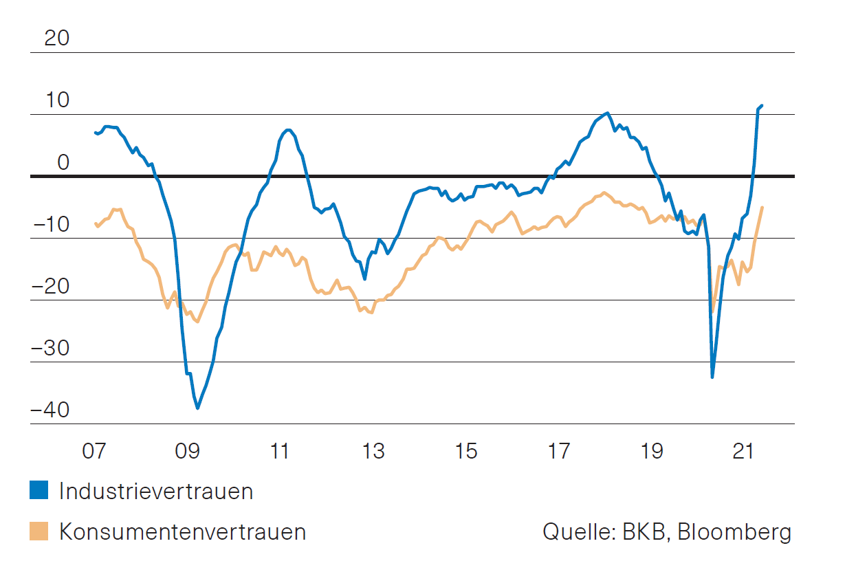 Wenig überraschend geht es auch in Europa dank der Impffortschritte und weiteren Lockerungen der Quarantänemassnahmen bei den Stimmungsindikatoren weiter nach oben. Dies gilt für Konsumenten und für Unternehmen (Abb. 2). Gedämpft wird die Stimmung der Unternehmen aber etwas durch Lieferengpässe und längere Lieferfristen. Dabei kommt dieses Phänomen nicht völlig unerwartet, sehen sich doch Produzenten einem enormen Nachholpotenzial ausgesetzt. Die daraus resultierenden Friktionen werden noch einige Zeit anhalten und zumindest übergangsweise mit zu höheren Preisen beitragen, dann aber zu steigenden Produktionen und einer deutlich höheren Wirtschaftsleistung führen. Ein Anstieg des BIP um über 4 % bleibt realistisch.