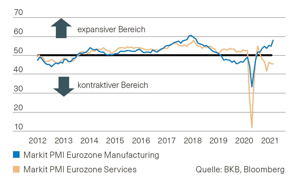 Der schleppende Impfstart und die Verlängerung restriktiver Lockdown-Massnahmen drücken weiterhin auf die Stimmung im europäischen Dienstleistungssektor. Der Einkaufsmanagerindex für den Dienstleistungsbereich tendierte im Februar seitwärts und befindet sich weiter im kontraktiven Bereich. Dies im Gegensatz zum deutlich expansiven Einkaufsmanagerindex für die Industrie (Abb. 2). Hier macht sich allerdings Preisdruck aufgrund von Lieferengpässen bei Halbleitern und Containern bemerkbar. Gemäss vorläufigen Daten ist die Wirtschaft in der Eurozone im Gesamtjahr 2020 um 6,8 % und im vierten Quartal 2020 um 0,6 % geschrumpft. Auch für das erste Quartal 2021 wird mit einem weiteren Rückgang gerechnet.