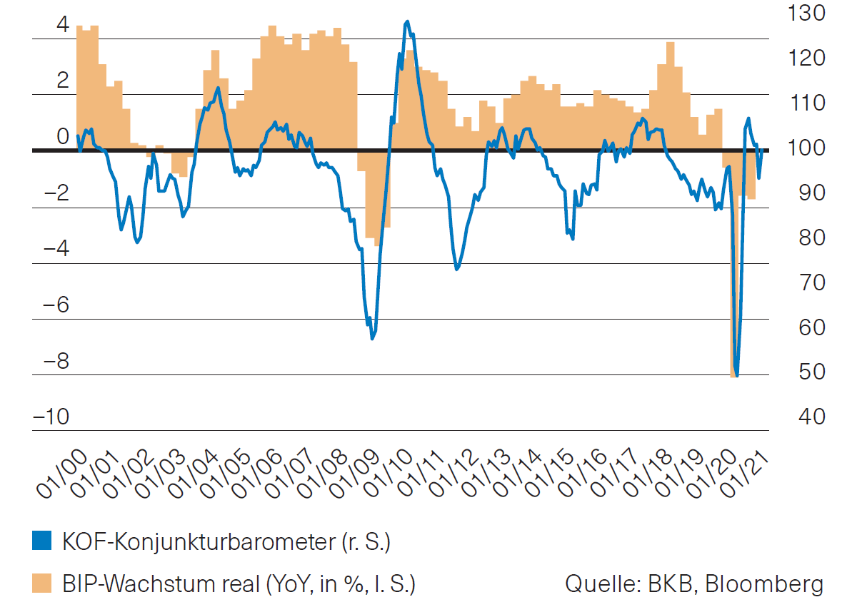 Während die Schweizer Wirtschaft für das Gesamtjahr 2020 einen Einbruch von 2,9 % zu verzeichnen hat, fiel das Wachstum im vierten Quartal 2020 mit 0,3 % besser aus als erwartet. Ausser den Staatsausgaben legten auch die Investitionen deutlich zu, das verarbeitende Gewerbe und der Handel verzeichneten Zuwächse. Wenig überraschend hatten dagegen das Gastgewerbe und der Kunst- und Unterhaltungsbereich starke Einbussen zu verkraften. Das KOF-Konjunkturbarometer (Abb. 3) konnte im Februar wieder über seinen langjährigen Durchschnitt steigen und signalisiert für die nächsten Monate einen dynamischeren Wirtschaftsverlauf.
