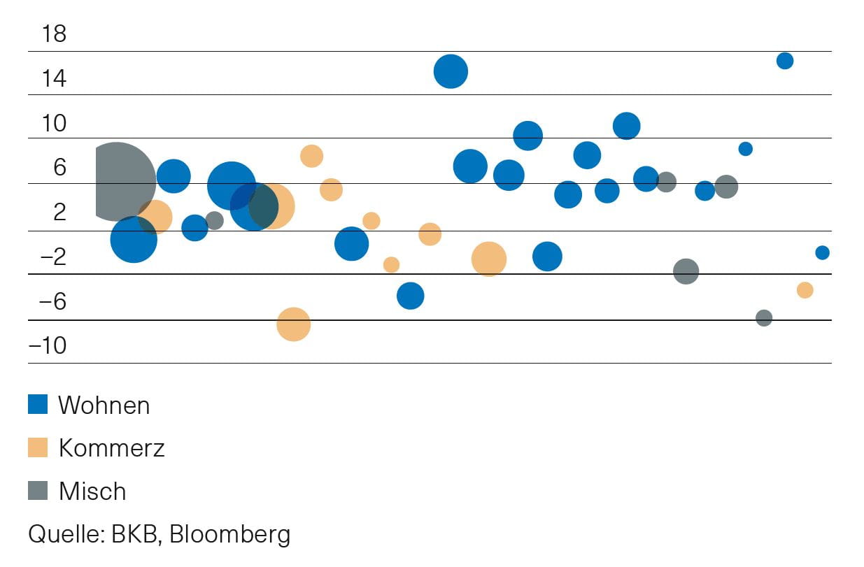 Abb.1: Performance Immobilienfonds seit Jahresbeginn nach Sektoren (Kugelgrösse = Fondgrösse)