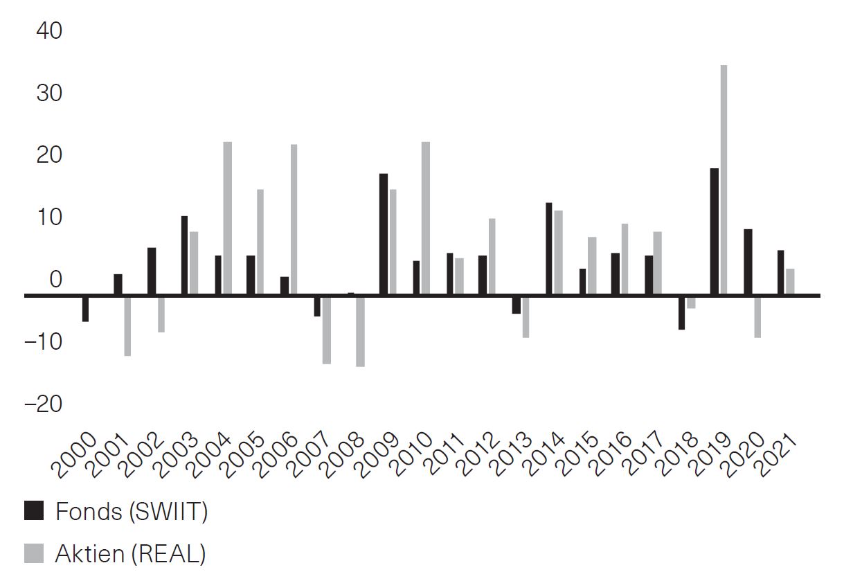 Nach dem erfolgreichen Jahr 2021 sind die Schweizer Immobilienanlagen verhalten in das neue Jahr gestartet. Sowohl die Fonds als auch die Immobilienaktien beendeten den Januar annähernd unverändert. Die Diskussionen im Immobilienbereich drehen sich meist um überhöhte Kaufpreise und den daraus resultierenden Risiken für Markt und Hypotheken. Aber steigende Kurse von Immobilienanlagen sind nicht neu. Seit dem Jahr 2000 gab es nur sehr wenige Rücksetzer (Abb. 1). Die meisten Jahre waren positiv für Immobilienanleger, was sich fundamental gut erklärt. Es gibt eine hohe Nachfrage nach Wohneigentum, stabile Mieten, attraktive Ausschüttungsrenditen und geringe Zinsen auf Obligationen. Die 2021 aufgekommenen Inflationsdebatten begünstigen zudem Immobilien als Sachwerte. Wir halten an unserer neutralen Gewichtung von 5 % im Segment der indirekten Immobilienanlagen fest.