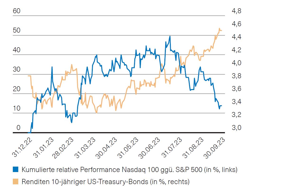 Abb. 2: Relative Performance Nasdaq 100 zu S&P 500 und Zinsen (Seit Jahresbeginn 2023); Quelle: BKB, Bloomberg