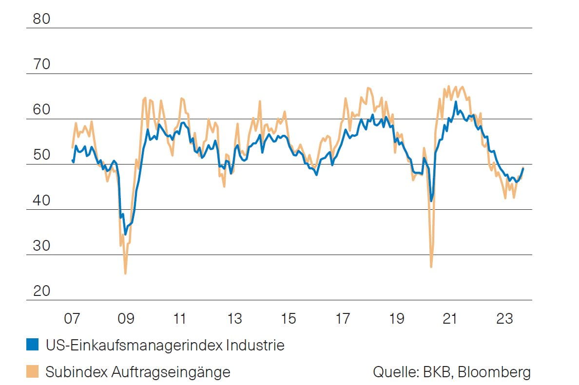 Nachdem eine US-Rezession 2023 für viele lange Zeit als ausgemacht galt, haben uns die Wirtschaftsdaten der vergangenen Monate eines Besseren belehrt. Die Konjunktur zeigt sich trotz der stark gestiegenen Leitzinsen und trotz der inversen Zinsstrukturkurve erstaunlich robust. Die gilt auch für den Häusermarkt, der vor den stark gestiegenen Finanzierungskosten bislang nicht in die Knie gegangen ist. Die durchschnittlichen Prognosen (Median, Bloomberg) lassen aktuell denn auch nur für das erste Quartal des kommenden Jahres eine schwache Wachstumsrate (QoQ) erwarten. Mit dem Risiko, dass diese auch negativ ausfallen könnte. Trotz allem darf man sich von den Prognosen nicht zu sehr in Sicherheit wiegen lassen. Es sind wie immer Momentaufnahmen, die sich teilweise recht rasch auch wieder verändern können. Aktuell gibt es aber keinen wirklichen Grund, eine Rezession an die Wand zu malen. Vielmehr hat sich die Stimmung in der US-Industrie zuletzt wieder verbessert. Der entsprechende Einkaufsmanagerindex (ISM) liegt zwar weiter unter der kritischen 50-Punkte-Marke, ist aber stärker als erwartet gestiegen (Abb. 1).