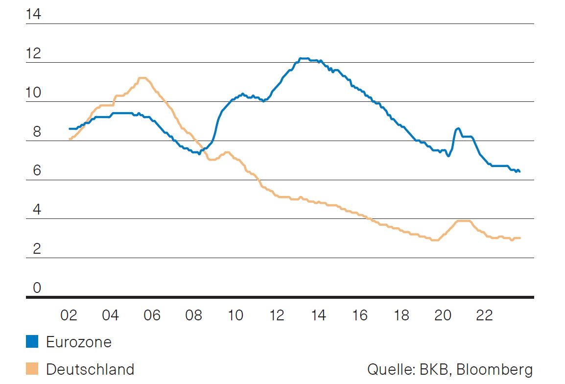 Die Erwartungen für die Konjunktur der Eurozone sind weiter eingetrübt. Die Wachstumsdynamik ist gering. Mit verantwortlich dafür ist u. a. die aktuelle Schwäche der deutschen Wirtschaft. Leicht negative Wachstumsraten sind in Deutschland kaum vermeidbar. Die grösste Volkswirtschaft Europas leidet dabei – im Vergleich zu den Zeiten vor dem Krieg Russlands gegen die Ukraine – an höheren Energiepreisen und einem in weiten Teilen ausgeprägten Fachkräftemangel. Dies zeigt auch ein Blick auf den Arbeitsmarkt. Trotz der schwierigen konjunkturellen Lage ist die Arbeitslosenquote auch im Vergleich zur Eurozone tief. Die harmonisierte Quote wird von Eurostat mit gerade einmal 3 % angegeben (Abb. 2).Abb. 2: Eurozone – Arbeitslosenquoten