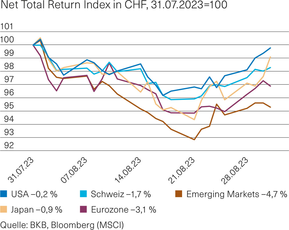 In den ersten drei Augustwochen verzeichneten die globalen Aktienmärkte überwiegend Verluste. Die Bonitätsherabstufung der USA durch die Rating-Agentur Fitch, die Einführung einer Übergewinnsteuer für italienische Banken und schwache Wirtschaftsdaten aus China samt erneuten Problemen im Immobiliensektor, die die Hoffnung auf globale Wachstumsimpulse schwinden liessen, bremsten die Kauflust der Anleger. Trotz der Erholungsbewegung zum Monatsende beendeten die grossen Aktienmärkte den August im Minus (Abb. 1). Auf globaler Sektorenebene waren Energie- und Gesundheitstitel deutlich stärker als der Gesamtmarkt. Aktien aus dem Bereich Grundstoffe zeigten dagegen eine ausgeprägte Underperformance.Aktienumfeld grundsätzlich solide
