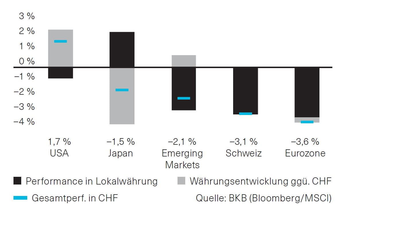 Die Aktienmärkte zeigten sich im Verlauf des Oktobers volatil und tendierten überwiegend schwächer. Die US-Wahlen und die Furcht vor stärkerem Protektionismus schürten Zweifel an den Wachstumsaussichten und trugen zur Verunsicherung der Investoren bei. Ein stärkerer US-Dollar verhalf jedoch dazu, dass der US-Aktienmarkt aus Sicht von Schweizer Investoren dennoch ein positives Monatsergebnis erwirtschaftete. Dagegen trug die Yen-Schwäche zu einem Plus bei den exportorientierten japanischen Aktien in Lokalwährung bei, das jedoch durch die Währungsverluste gegenüber dem Schweizer Franken aufgezehrt wurde. Schwellenländeraktien erlitten ebenfalls Verluste, nachdem das durch staatliche Stimuli angefachte Kursfeuerwerk am chinesischen Aktienmarkt zumindest vorerst wieder erloschen ist (Abb. 1).