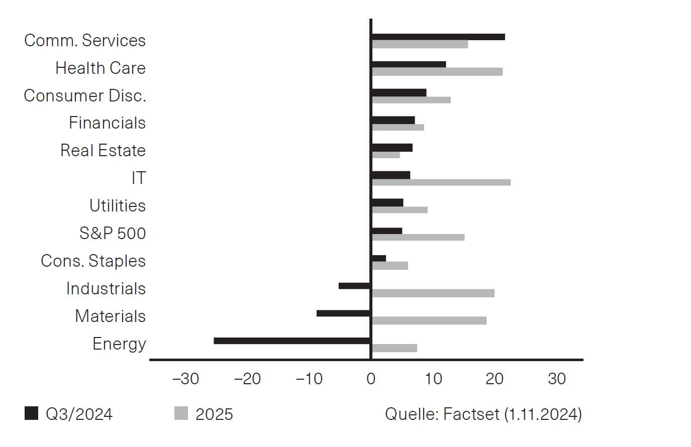 Zum Monatsende hatten 70 % der Unternehmen aus dem S&P-500-Index ihre Geschäftszahlen für das dritte Quartal veröffentlicht, von denen 75 % positive Gewinnüberraschungen bargen. Dies allerdings auf moderatem Niveau, das Gewinnwachstum gegenüber dem Vorjahresquartal wird gemäss Factset für den Index mit gut 5 % erwartet. Am höchsten war das Wachstum der US-Quartalsgewinne in den Sektoren Kommunikationsdienstleister und Gesundheit, am niedrigsten bei Energietiteln und Grundstoffunternehmen. Für das kommende Jahr rechnen die Analysten derzeit mit sehr robusten Gewinnsteigerungen im Bereich von 15 % für den Gesamtindex (Abb. 2). Ein derart positives Gewinnwachstum würde auch helfen, die derzeit hohen Bewertungen am US-Aktienmarkt zu rechtfertigen.