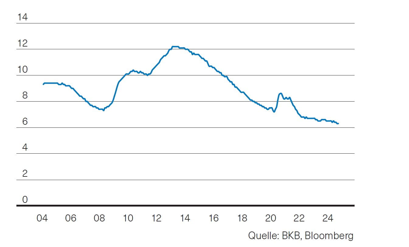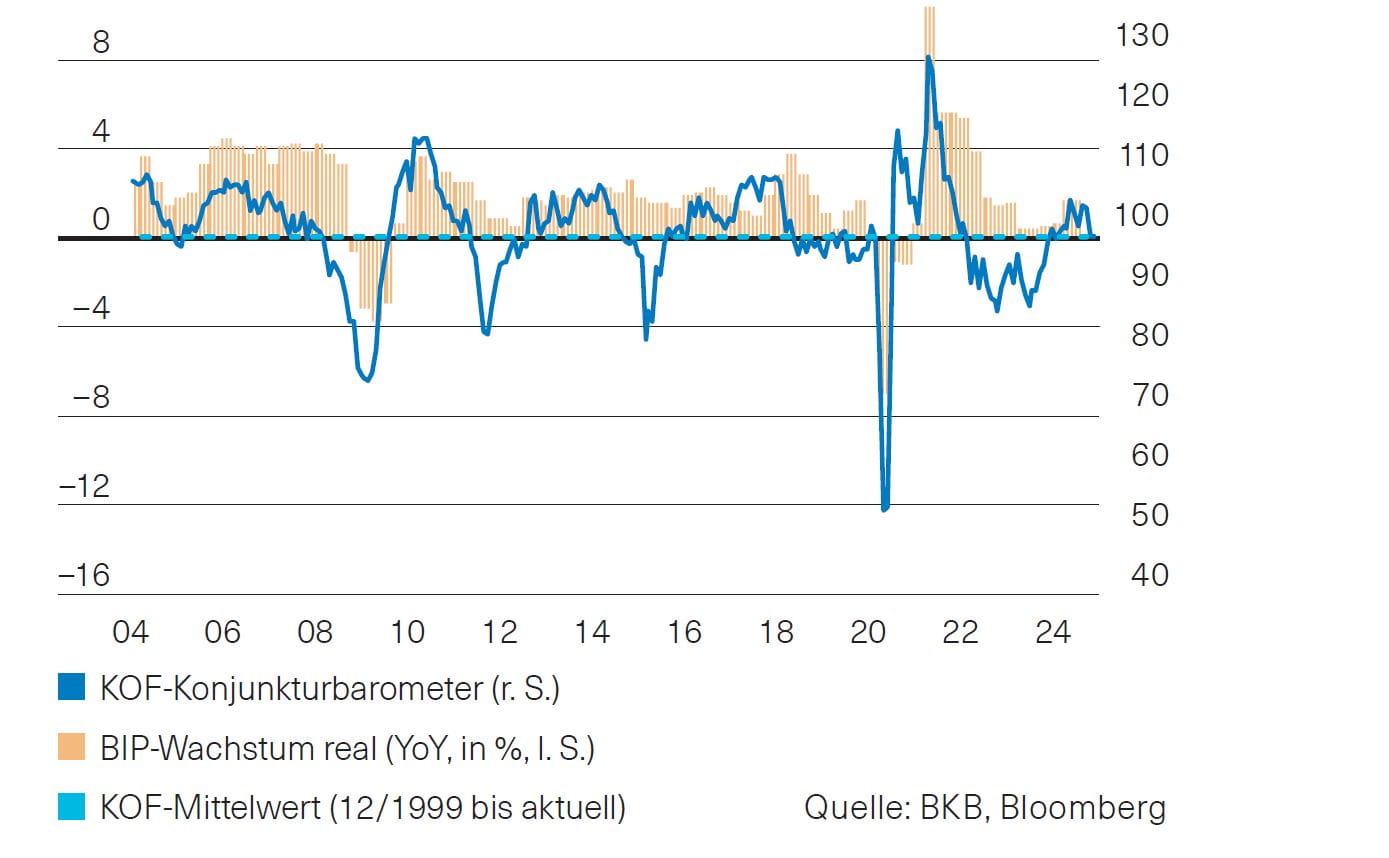Nachdem das KOF-Konjunkturbarometer im September überraschend zulegen konnte, hat es im Oktober wieder an Boden verloren. Mit 99.5 Punkten bewegt es sich nahe seinem langfristigen Durchschnitt (Abb. 3). Auch die Einkaufsmanagerindizes liefern keinen Grund für eine deutlich positive Konjunkturerwartung. Der Index für die Industrie wie auch jener für den Dienstleistungsbereich bewegen sich nahe der kritischen 50-Punkte-Marke und signalisieren eine positive, aber unterdurchschnittliche Konjunkturdynamik. Die Konsensprognose von 1,4 % für 2025 erscheint deshalb zumindest Stand heute etwas optimistisch.