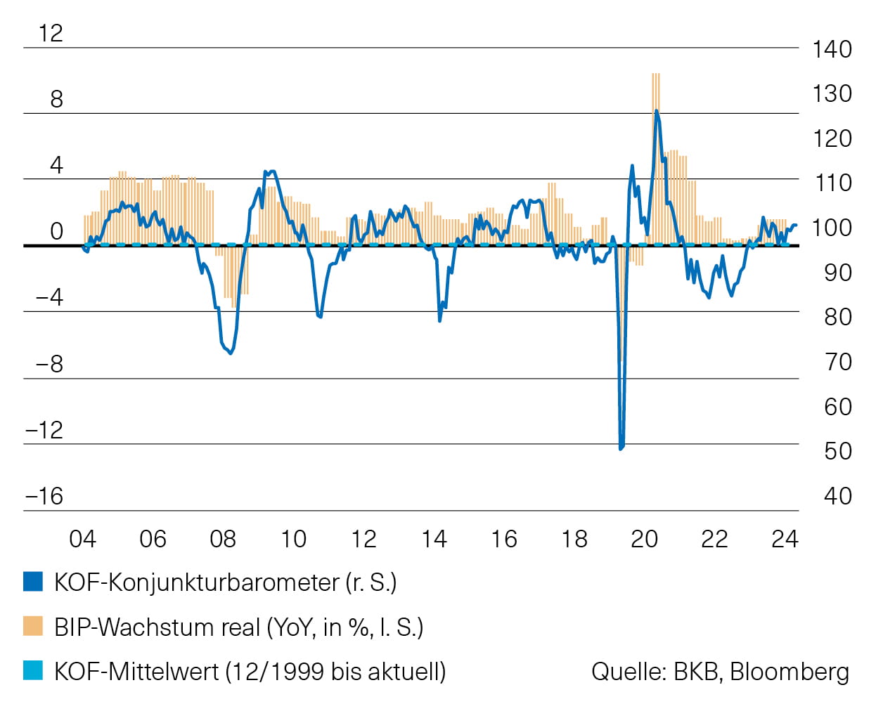 Uneinheitliche Signale Trotz der Verabschiedung des deutschen Fiskalpakets ist die Stimmung in der Schweizer Industrie entgegen den Erwartungen im März wieder gesunken. Während am Markt für den Einkaufsmanagerindex der Industrie mit einem Anstieg über die kritische 50-Punkte-Marke gerechnet wurde, stellte sich der Indikator am Ende mit 48.9 Punkten ein. Er liegt weiterhin im kontraktiven Bereich. Auch der Index für den Dienstleistungsbereich gab stärker auf nun 50.6 Punkte nach. Positiv zeigt sich dagegen das KOF-Konjunkturbarometer (Abb. 3). Nach dem jüngsten Anstieg liegt es über seinem langfristigen Durchschnitt.Abb. 3: Schweiz – KOF-Konjunkturbarometer