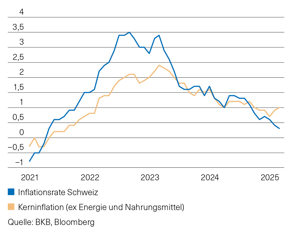 Die Schweizerische Nationalbank (SNB) lockerte im März ihre Geldpolitik ein weiteres Mal und senkte den Leitzins zum fünften Mal in Folge auf neu 0,25 %. Seit der letzten Lagebeurteilung hat sich die Inflation wie erwartet entwickelt. So sank die Gesamtinflation von 0,7 % im November auf 0,3 % im Februar (Abb. 1). Für 2025 liegt die Prognose der SNB bei 0,4 %, für 2026 bei 0,8 % und ebenfalls 0,8 % für 2027. Das Wirtschaftswachstum in der Schweiz fiel im vierten Quartal 2024 solide aus. Allerdings sind die Wirtschaftsaussichten infolge der global gestiegenen handels- und geopolitischen Risiken deutlich unsicherer geworden. Vom Schweizer Franken ging kein Handlungsdruck aus. In den letzten Monaten hat der Franken gegenüber dem Euro etwas an Wert verloren. Ein massgeblicher Grund dürften die geplanten Militärausgaben der EU und das gewaltige Ausgabenpaket Deutschlands sein. Dessen Ankündigung führte zu höheren Anleihezinsen im Euroraum, was die relative Attraktivität des Frankens mindert.