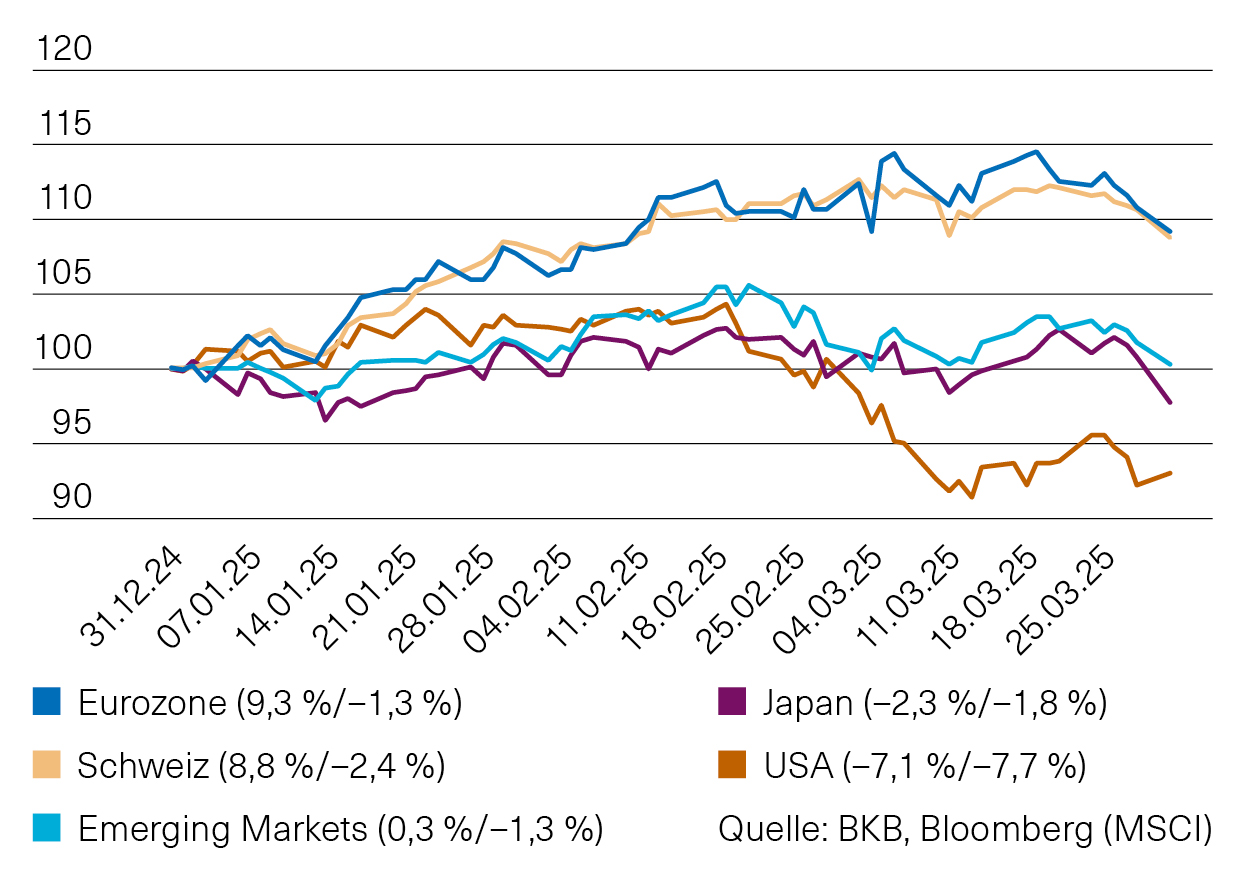 Die Performance der globalen Aktienmärkte driftete im März weiter auseinander (Abb. 1). Während der amerikanische Aktienmarkt mit –7,7 % in CHF den schwächsten Monat seit Dezember 2022 verzeichnete, erfuhren die europäischen Aktienmärkte zunächst insbesondere aufgrund von Fiskalprogrammen wie dem angekündigten Rüstungs- und Infrastrukturpaket in Deutschland weiteren Auftrieb. Die kurzfristige Bekanntgabe der Erhöhung von US-Importzöllen auf Automobile und Autoteile auf 25 % führte dann in den grossen Aktienmärkten zu deutlichen Kursverlusten. Die optimistische Mutmassung, dass die Zölle als Verhandlungsmasse für einen «Deal» dienen könnten, wich der Furcht vor einer Verhärtung der Fronten im Handelskrieg mit Auswirkungen auf eine höhere Inflation und abnehmende Wirtschaftsdynamik.