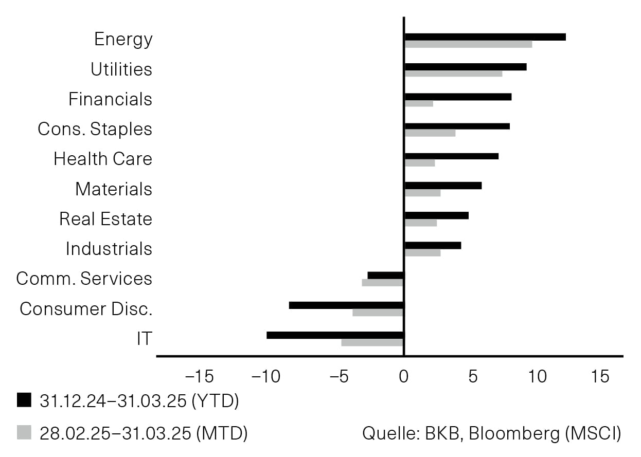 Nachdem wir Mitte Februar die performancebedingte Übergewichtung bei den Aktien reduziert hatten, halten wir weiterhin an einer neutralen Aktienpositionierung gegenüber der strategischen Quote fest.Abb. 2: Globale Sektorperformance relativ zum MSCI World Index