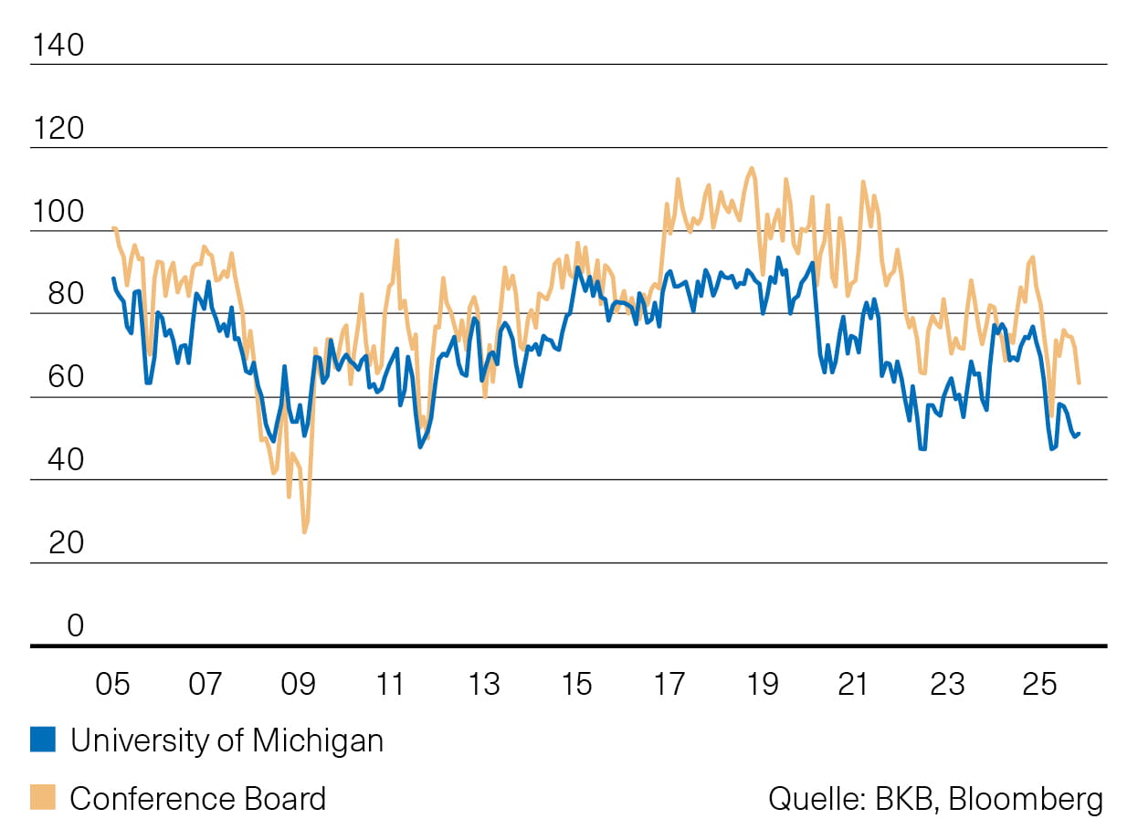 Obwohl der Shutdown in den Vereinigten Staaten beendet wurde, stehen weiterhin wichtige Wirtschaftsdaten nicht zur Verfügung. Dies gilt unter anderem für die US-Arbeitsmarktberichte für die Monate Oktober und November. Diese sollen erst per 16. Dezember 2025 publiziert werden. Und damit nach der Dezembersitzung der US-Notenbank. Verfügbar sind dagegen Stimmungsindikatoren von Konsumenten und von Unternehmen. Auffällig ist, dass sich im November die Erwartungskomponenten sowohl beim Konsumentenvertrauen des Conference Board wie auch bei jenem der University of Michigan (Abb. 1) weiter auf tiefen Niveaus bewegen. Die Erwartungskomponente der University of Michigan liegt nahe den Tiefständen der vergangenen 20 Jahre. Auch die Stimmung in der Industrie bleibt eingetrübt. Der Einkaufsmanagerindex der Industrie (ISM) liegt aktuell bei 48.2 Punkten. Negativ ist dabei, dass die Subkomponenten des Indikators Inflationsdruck und einen schwächeren Arbeitsmarkt signalisieren. Die Konsensprognose für das BIP für 2026 liegt unter dem Durchschnitt der vergangenen 25 Jahre und verspricht einen Anstieg nahe 2 %.