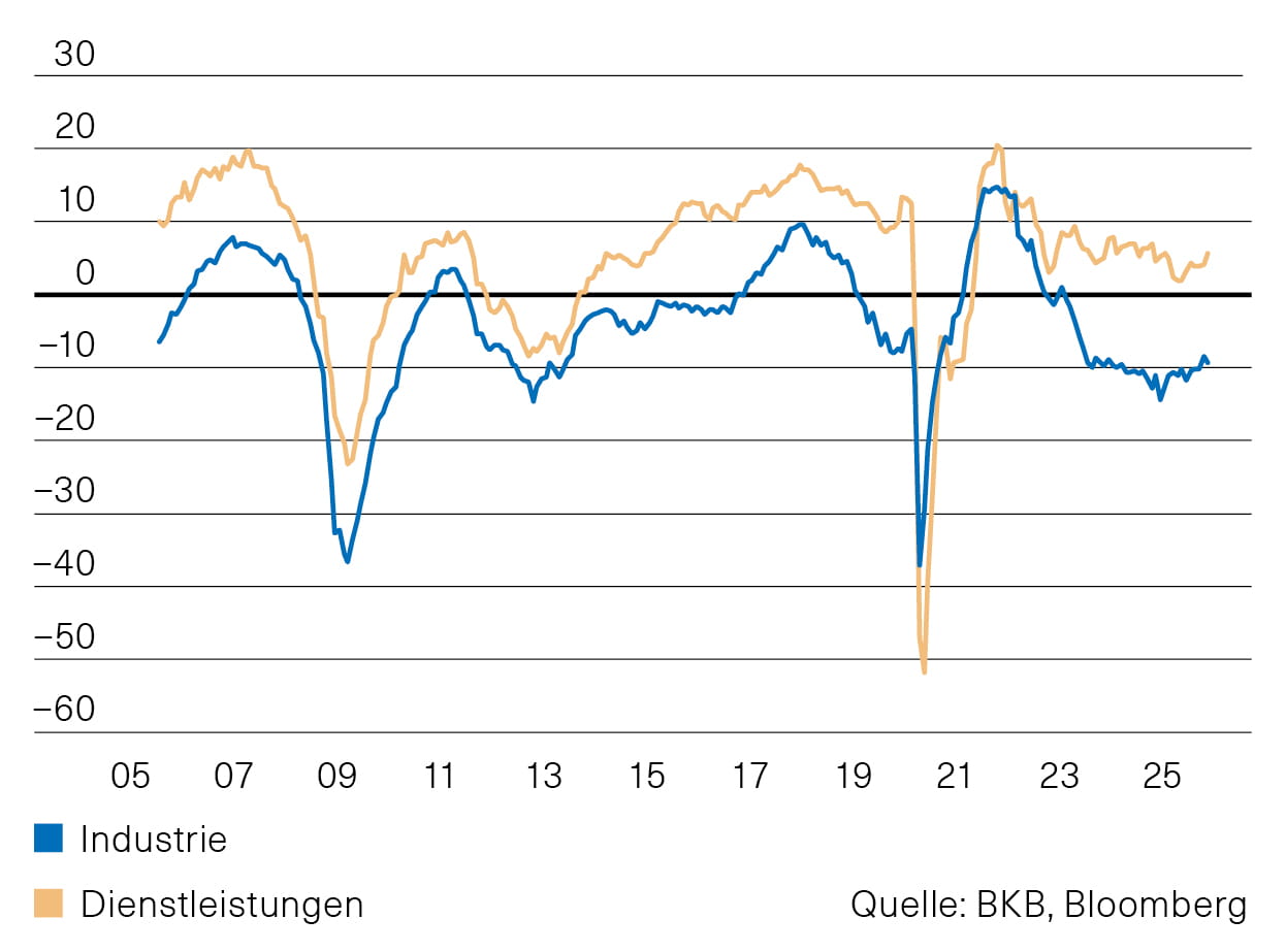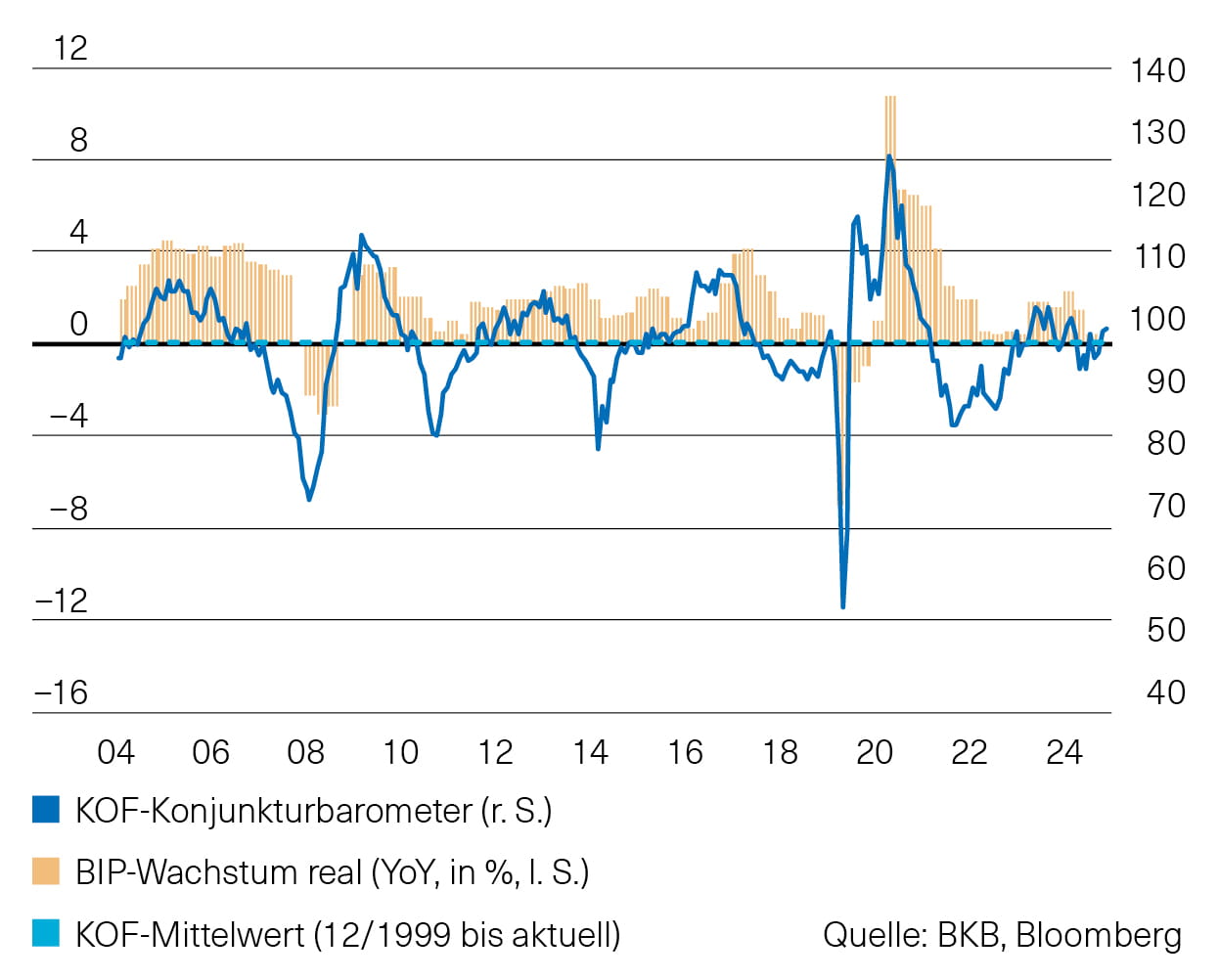 Nachdem das Schweizer BIP im 2. Quartal noch leicht zulegen konnte, war im 3. Quartal ein Rückgang von 0,5 % (QoQ) zu verzeichnen. Ursächlich hierfür war gemäss SECO insbesondere eine tiefere Wertschöpfung in der chemisch-pharmazeutischen Industrie, nachdem es in diesem Bereich im 1. Halbjahr aufgrund der US-Handelspolitik zu Vorzieheffekten gekommen war. Die starken Verzerrungen dürften aber mit der Einigung auf einen Zollsatz von 15 % der Vergangenheit angehören. Entsprechend deutet das KOF-Konjunkturbarometer auf eine zwar unterdurchschnittliche, aber positive Konjunkturentwicklung hin (Abb. 3).
