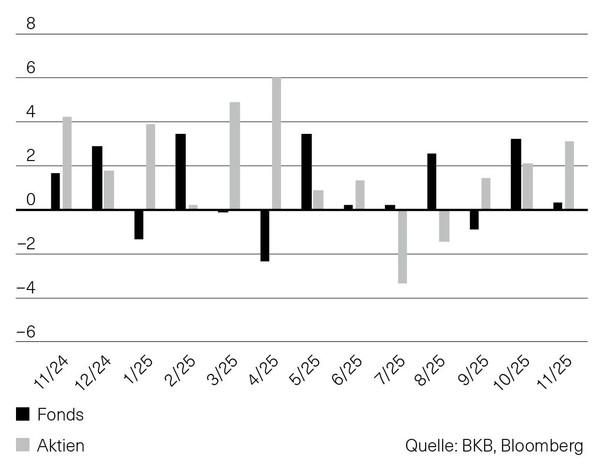 Im November entwickelten sich die Renditen zehnjähriger Staatsanleihen unterschiedlich. Während in den USA die Rendite leicht nachgab, zogen in Deutschland und der Schweiz die Renditen 10-jähriger Staatsanleihen im November 2025 moderat an. In den kommenden Monaten dürften die Renditen in allen drei Regionen überwiegend stabil bleiben. In den USA sind moderate Schwankungen möglich, mittelfristig könnte es aber auch zu leichten Anstiegen kommen. In Deutschland und der Schweiz wird ein Seitwärtstrend erwartet, grössere Veränderungen sind nur bei unerwarteten Schocks wahrscheinlich. Wir behalten unsere Untergewichtung bei den Obligationen in Schweizer Franken bei.