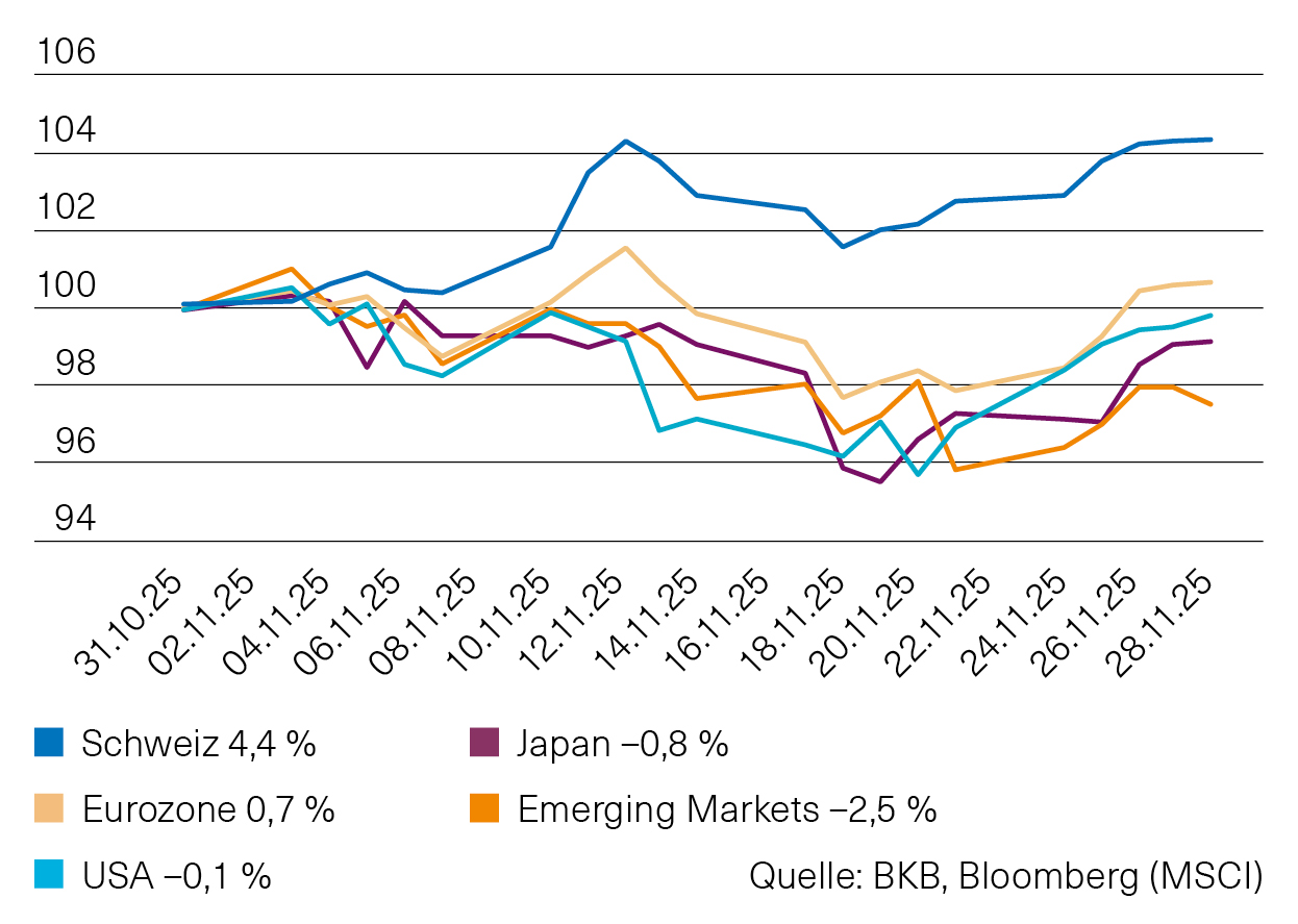 Die globalen Aktienmärkte boten im November ein gemischtes Performancebild. Sehr erfreulich war die Entwicklung am Schweizer Aktienmarkt, wo das Indexschwergewicht Roche dank Forschungserfolgen mit einem Kursplus von 18,7 % herausragte – nach einem Anstieg von 20 % im Januar 1997 der zweithöchste monatliche Kursanstieg für die Aktie in den letzten 35 Jahren. Andere grosse Aktienmärkte legten dagegen nach der starken Aufwärtsbewegung in den Vormonaten eine Verschnaufpause ein (Abb. 1).