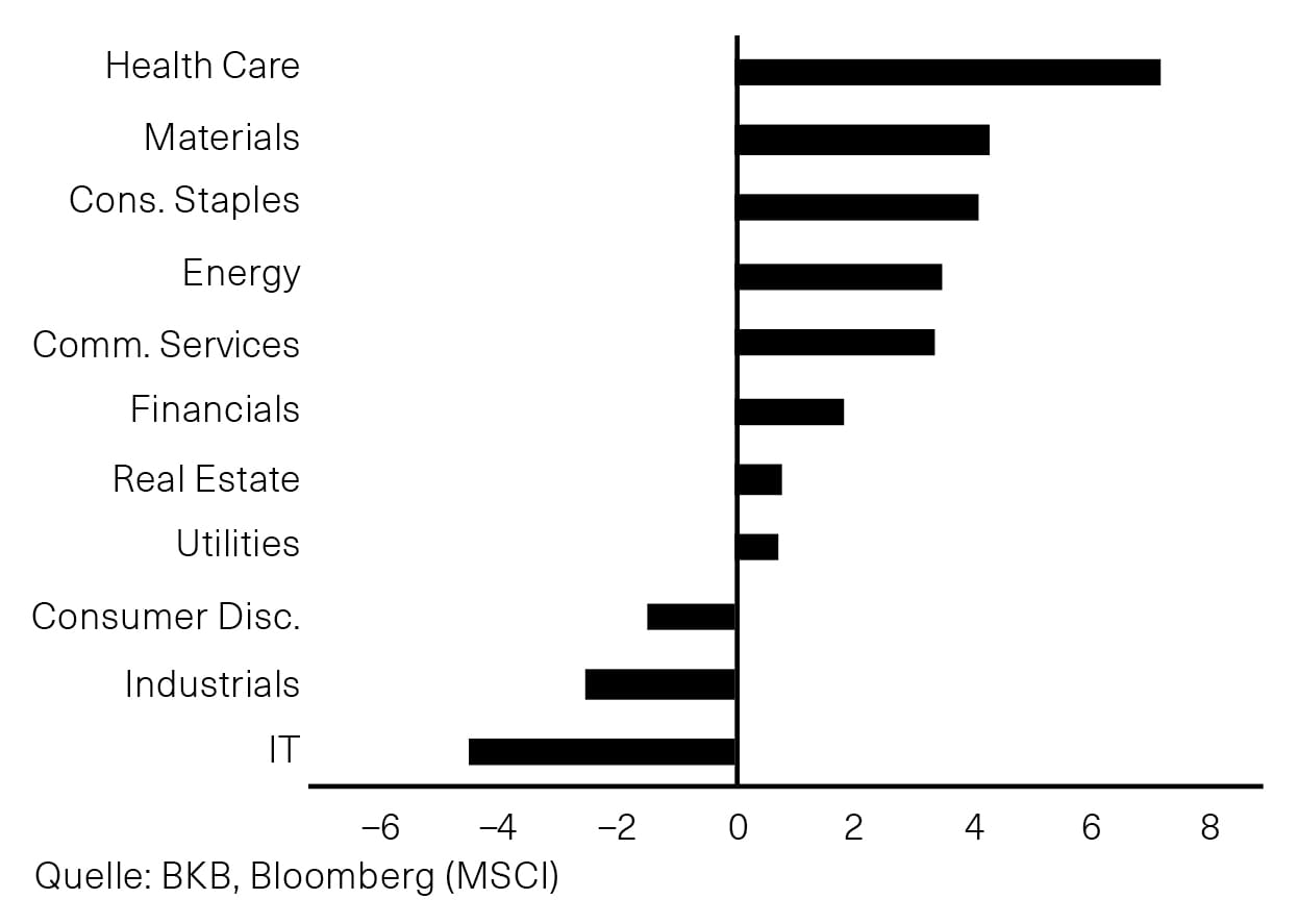Angesichts der hohen Bewertungen von Technologietiteln und Zweifeln an der Profitabilität der enormen KI-Investitionen hielten sich die Investoren trotz guter Geschäftsergebnisse von diesem Bereich fern. IT-Werte waren global der schwächste Sektor im November. Angesichts der Rotation zeigten sich die vorherigen regionalen Gewinner mit hoher IT-Konzentration wie USA, Taiwan oder Korea schwach. Dagegen führten Aktien aus dem Gesundheitssektor das Sektorranking an (Abb. 2). Davon profitierte auch der Schweizer Aktienmarkt.