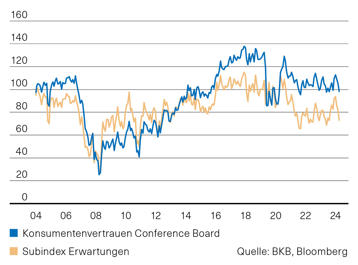 Allen Unwägbarkeiten zum Trotz signalisieren die verfügbaren Konsensprognosen aktuell eine positive Konjunkturentwicklung in den USA im laufenden Jahr. Im Durchschnitt rechnen die Auguren gemäss Bloomberg mit einem Anstieg des US-BIP von 2,3 % für 2025. Dies wäre ein leicht überdurchschnittlicher Anstieg der Wirtschaftsleistung im Vergleich der letzten 25 Jahre. Dabei dürfen die Risiken für dieses positive Szenario jedoch nicht vernachlässigt werden. Die teils erratisch anmutenden Entscheidungen von Donald Trump in Bezug auf die Handels- und Wirtschaftspolitik, aber auch die geopolitischen Kehrtwenden in wichtigen Bereichen sorgen für Verunsicherung dies- und jenseits des Atlantiks. Dies betrifft nicht nur Unternehmen, diese Entwicklung macht vielmehr auch vor den Konsumenten nicht halt. Dabei ist der private Verbrauch die zentrale Stütze für die mittelfristige Entwicklung der US-Konjunktur. Er ist für rund 70 % der gesamten Wirtschaftsleistung in den USA verantwortlich. Es gilt deshalb genau zu verfolgen, wie sich die Stimmung unter den Konsumenten in den kommenden Monaten entwickeln wird. Zuletzt kam diese jedenfalls nochmals etwas stärker unter Druck (Abb. 1).