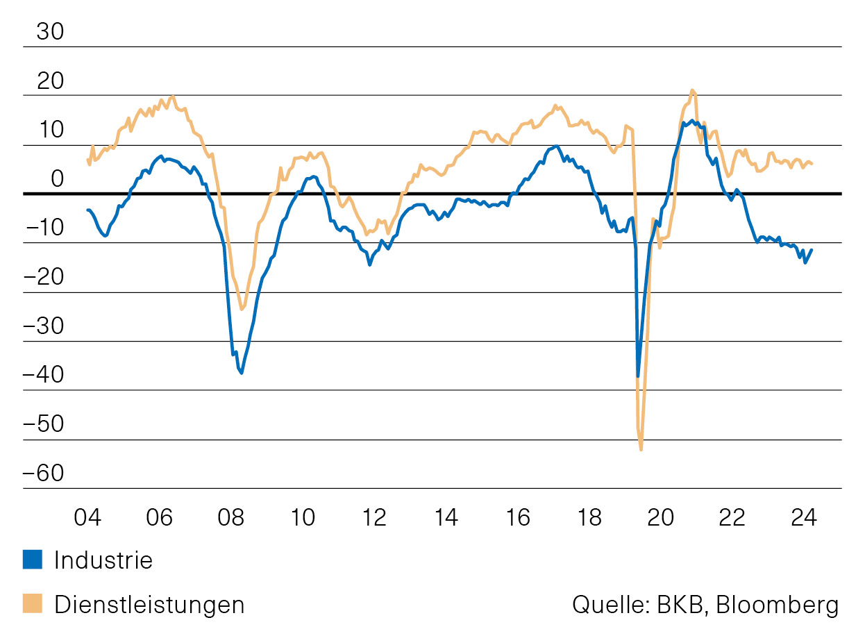 Nachdem einige Stimmungsindikatoren bereits im Januar etwas besser als erwartet ausgefallen sind, konnten sie auch im Februar erneut leicht zulegen (Abb. 2). Dies gilt erfreulicherweise auch für den Bereich der Industrie, der sich schwierigen Rahmenbedingungen gegenübersieht. Trotz der leichten Stimmungsaufhellungen ist es deutlich zu früh, für die Konjunktur in der Eurozone Entwarnung zu geben. Die Indikatoren aus dem Industriebereich bewegen sich auch weiterhin auf einem vergleichsweise tiefen Niveau und signalisieren eine schwache Dynamik der wirtschaftlichen Entwicklung.