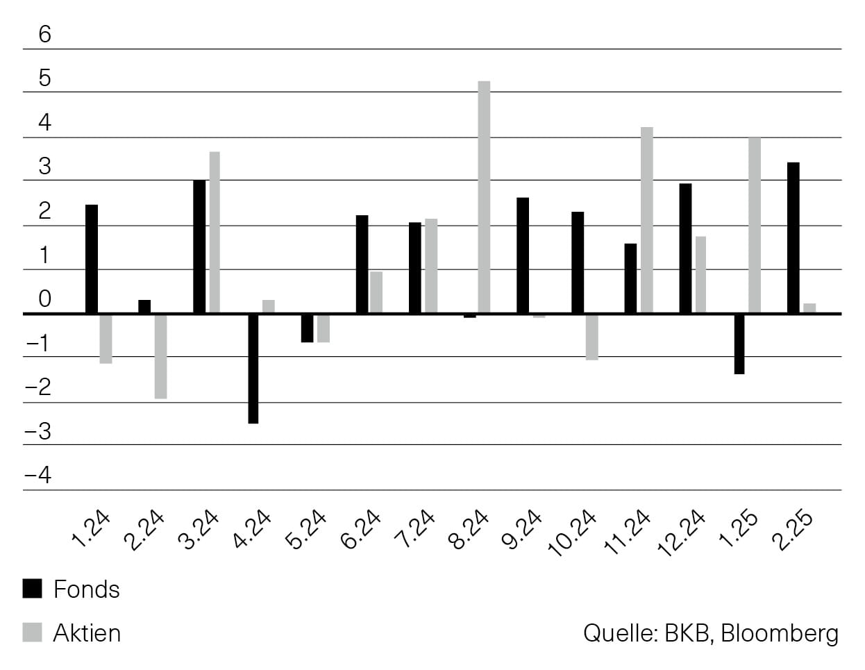 Insgesamt waren die Staatsanleihemärkte im Februar von einer erhöhten Volatilität geprägt, bedingt durch geldpolitische Entscheidungen, wirtschaftliche Unsicherheiten und politische Entscheidungen. Anleger sollten diese Schwankungen berücksichtigen und ihre Investmentstrategien entsprechend anpassen. Ein aktives Management kann dabei helfen, Marktineffizienzen besser zu nutzen und stabilere Einkünfte zu generieren. Wir favorisieren globale Unternehmensanleihen (mit Fokus auf die USA) und behalten unsere leichte Untergewichtung bei den Obligationen in CHF bei.
