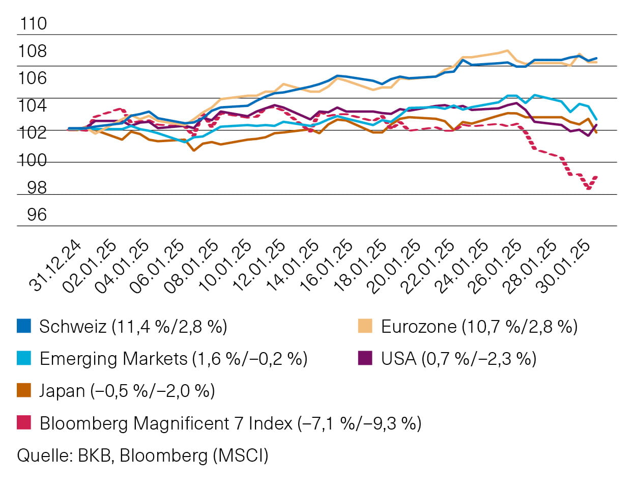 Die europäischen Aktienmärkte konnten im Februar ihre Aufwärtsbewegung – mit einem Plus von 2,8 % in CHF sowohl für die Schweiz als auch für die Eurozone – weiter fortsetzen und haben seit Jahresbeginn eine Performance von rund 11 % erzielt. Im Gegensatz dazu musste der amerikanische Aktienmarkt im Februar Einbussen hinnehmen. Diese waren zu einem grossen Teil den teils deutlichen Kursverlusten von Indexschwergewichten der «Glorreichen 7», insbesondere Tesla, Alphabet/Google und Amazon, geschuldet. Der exportorientierte japanische Aktienmarkt litt unter einer weiteren Aufwertung des Yen. Der Schwellenländerindex konnte sich dank Kursgewinnen am chinesischen Aktienmarkt halten, der unter anderem durch ein Treffen von Präsident Xi mit Unternehmensführern und Hoffnungen auf nationale Kapazitäten im Bereich künstlicher Intelligenz beflügelt wurde (Abb. 1).