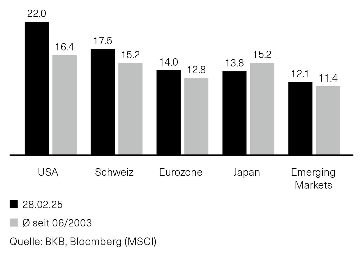 Trotz der grundsätzlich positiven, wenn auch unterdurchschnittlichen globalen Konjunkturerwartungen sorgt die erratische Politik der neuen amerikanischen Regierung bei Konsumenten und Investoren für Verunsicherung. Die Einführung und die Erhöhung von Zöllen bergen Inflationsgefahren und die Kosteneinsparungsambitionen in der US-Verwaltung drücken auf die amerikanische Konsumentenstimmung. Angesichts der weiterhin hohen Bewertungen am US-Aktienmarkt (Abb. 2) haben wir Mitte Februar die performancebedingte Übergewichtung bei den Aktien auf die neutrale Quote zurückgeführt.