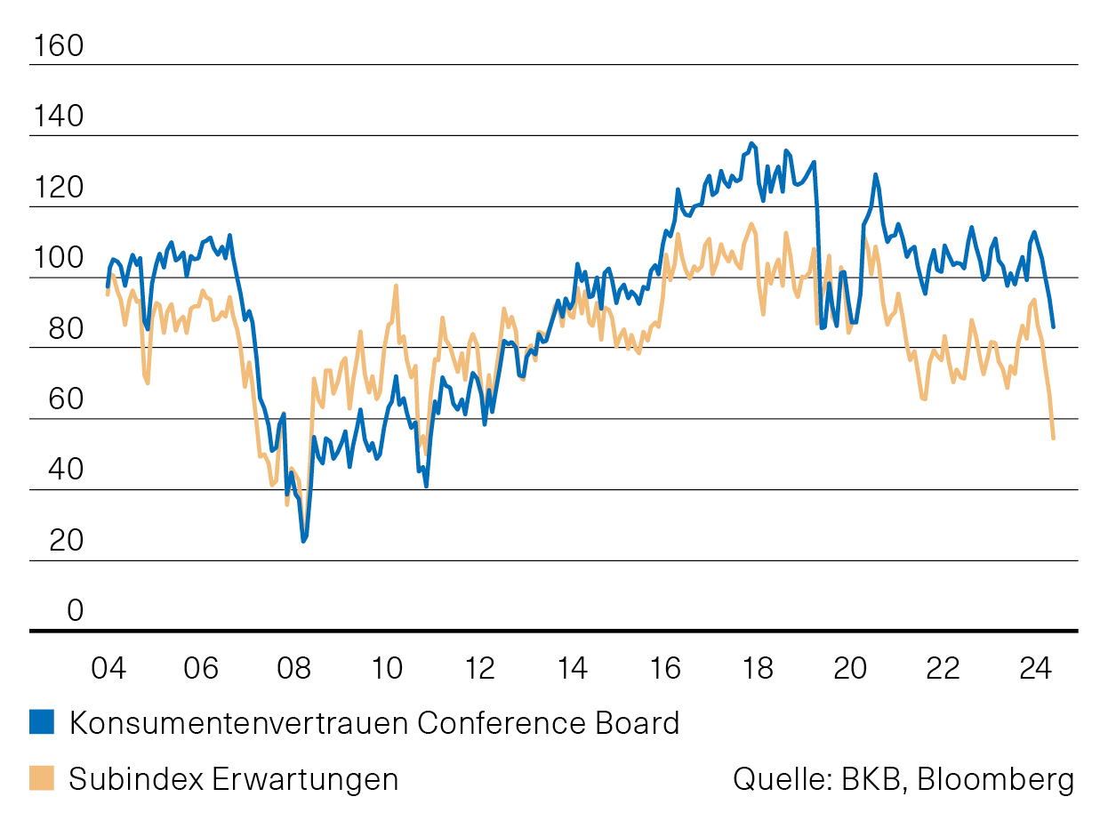 Nachdem in den vergangenen Wochen insbesondere Stimmungsindikatoren in Bezug auf die US-Wirtschaft im Fokus gestanden hat, wurde nun die erste Schätzung für das BIP im 1. Quartal 2025 veröffentlicht. Die Daten sind dabei speziell in Bezug auf den Aussenhandel verzerrt, haben doch viele Firmen die Zeit genutzt, um vor Donald Trumps «Liberation Day» noch Waren in die USA einzuführen. Bei den nun veröffentlichten Daten sind dabei unabhängig von den US-Importen erste Bremsspuren erkennbar. Das BIB gab leicht nach, und zwar um 0,3 % (QoQ, annualisiert), nachdem es im 4. Quartal 2024 noch um 2,4 % zulegen konnte. Der private Verbrauch, der für fast 70 % der US-amerikanischen Wirtschaftsleistung verantwortlich ist, stieg nur noch um 1,8 %. Wird diese Zahl am Ende bestätigt, so wäre das der geringste Anstieg seit fast zwei Jahren. Die Befürchtungen sind jedenfalls vorhanden, dass dieses wichtige Aggregat der gesamtwirtschaftlichen Nachfrage auch in den kommenden Quartalen leiden wird. So ist die Erwartungskomponente des vom Conference Board erhobenen Indikators zur Konsumentenstimmung zwischenzeitlich auf den tiefsten Stand seit 2011 (Abb. 1) gesunken.Abb. 1: USA – Konsumentenvertrauen