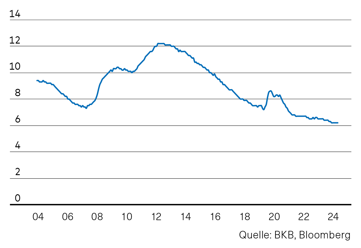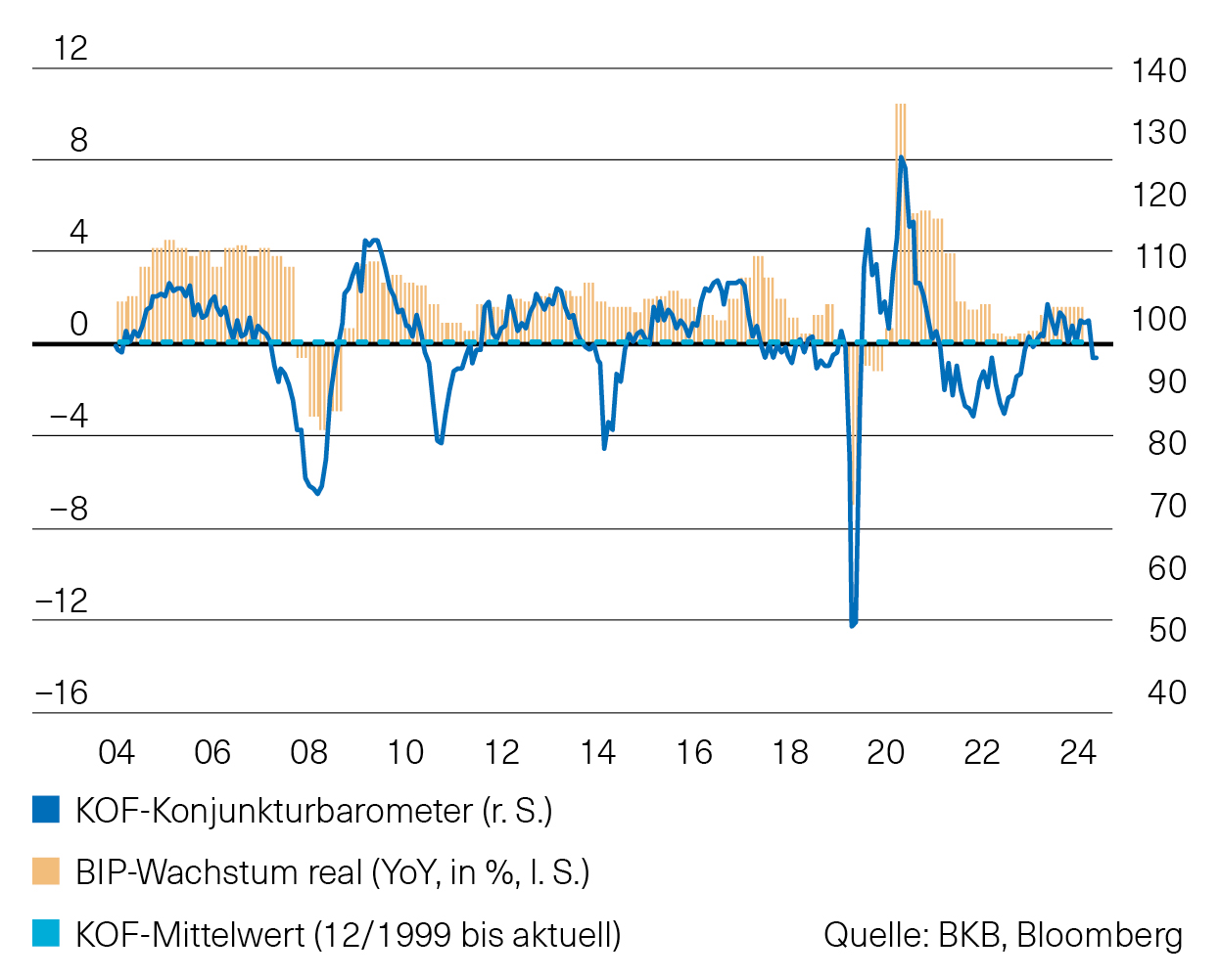Im April ist die Stimmung in der Schweizer Industrie weiter gesunken. Der Einkaufsmanagerindex der Industrie wird nun mit 45.8 Punkten deutlich unter der kritischen 50-Punkte- arke notiert und damit im kontraktiven Bereich. Auch das KOF-Konjunkturbarometer leidet unter der erratischen Zollpolitik der USA (Abb. 3). Es gab gut sechs Punkte nach und liegt unter dem langfristigen Durchschnitt. Ein kleiner Lichtblick kommt von den Dienstleistungen. Hier hat der Einkaufsmanagerindex wieder etwas zugelegt und deutet mit 52.4 Punkten auf eine – wenn auch nur leichte – Expansion der wirtschaftlichen Tätigkeit in diesem Bereich hin.Abb. 3: Schweiz – KOF-Konjunkturbarometer